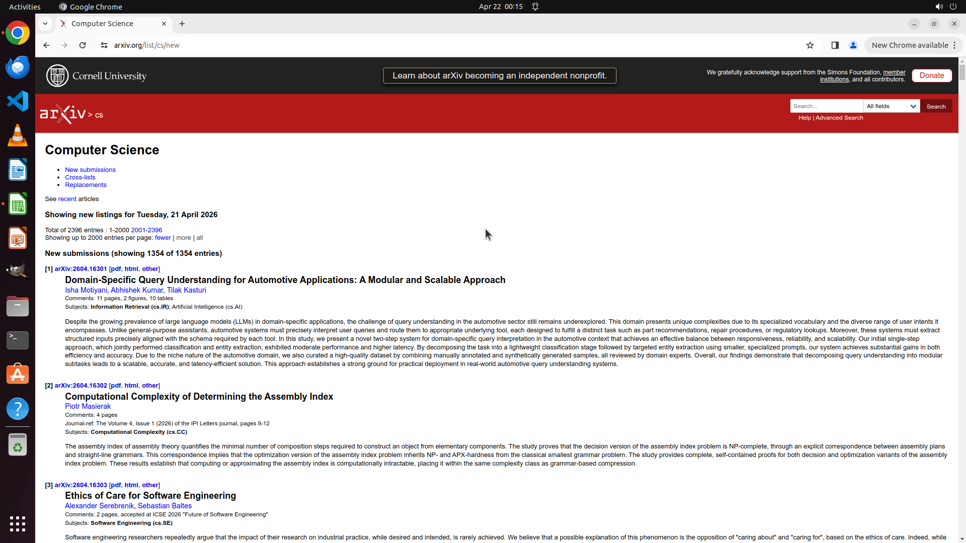 - Successfully navigated to arXiv Computer Science new submissions page (arxiv.org/list/cs/new)