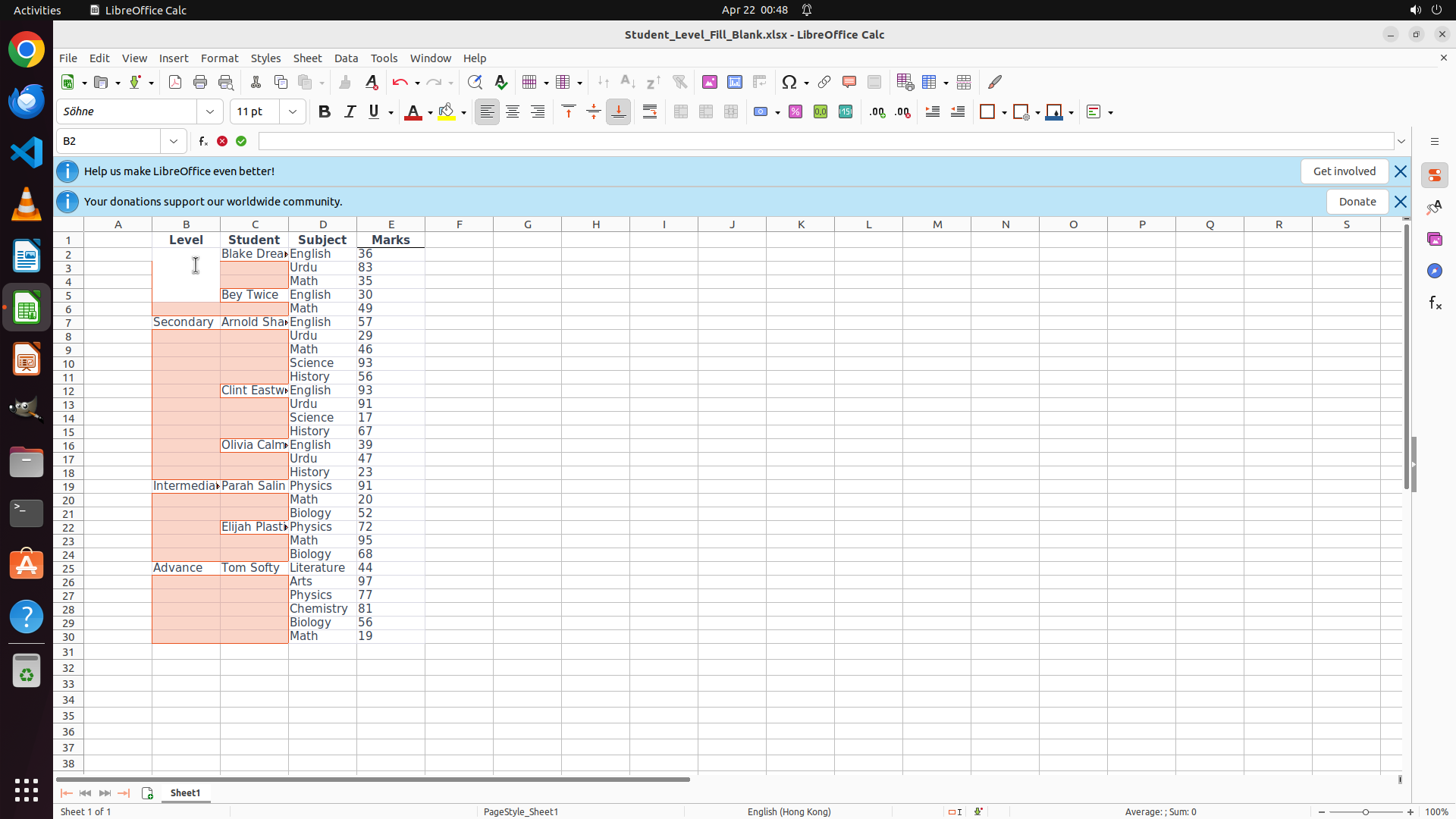 1: Fill blank cells in column B (Level) for range B2:B30