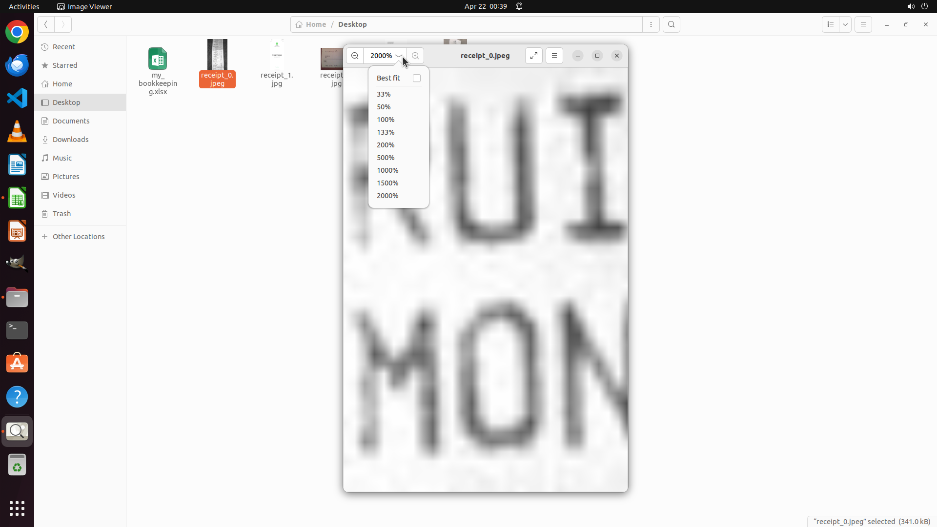 当前屏幕显示Image Viewer应用仍以2000%的极高缩放比例打开receipt_0.jpeg收据文件。上一次点击缩放下拉菜单的操作似乎没有成功打开菜单,屏幕状态没有变化,仍然显示"RUI"和"MON"的局部放大文字。