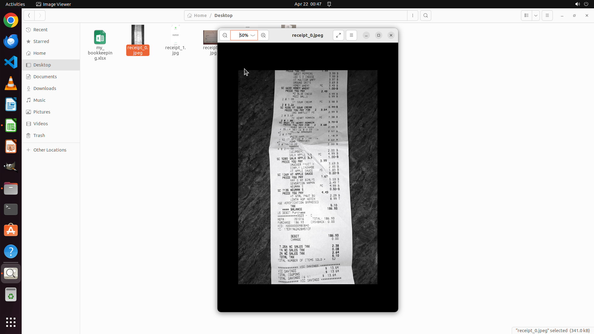 ## 6. 上一次操作的前50步操作简述 ### 步骤 1: - 描述: ``` #### 重要信息 当前屏幕显示Image Viewer应用打开了receipt_0.jpeg收据文件。这是一个购物小票,显示了多项商品购买记录。我可以看到: - 小票底部显示 TOTAL: 186.93 - 小票中部显示了各种商品明细 - 需要向上滚动查看小票顶部以获取商家名称和交易日期 - 文件浏览器左侧显示Desktop文件夹中有my_bookkeeping.xlsx文件和多个receipt文件 #### 情况分析与思考过程 根据策略树,任务分为三个阶段: 1. 查看并提取所有5个收据文件的交易信息(日期、商家、金额、类别) 2. 整理数据,筛选4月20-21日的支出记录 3. 更新my_bookkeeping.xlsx记账表 当前正在查看第一个收据receipt_0.jpeg。为了提取完整信息,我需要: - 向上滚动查看小票顶部的商家名称和日期 - 记录总金额186.93 - 判断类别(从商品看像是Grocery/Food) 由于小票顶部信息(商家和日期)被截断了,我需要向上滚动来查看完整信息。 ``` - 操作: 1. 鼠标滚轮在坐标 (0.516, 0.486) 向上滚动,滚动量 10 ### 步骤 2: - 描述: ``` #### 重要信息 当前屏幕显示Image Viewer应用打开了receipt_0.jpeg收据文件。经过向上滚动后,我现在可以看到收据的中间和底部部分: - 收据显示购买了多种商品:酸奶油、罗马生菜、蘑菇、香蕉、大蒜、西红柿、芒果、黄瓜、苹果、柠檬水、苹果酱、面包圈、餐巾纸、花生酱、啤酒等 - 总金额:$186.93 - 支付方式:US DEBIT Purchase - 税费:$5.10 - 底部显示"**** BALANCE 186.93" 但是收据的顶部(包含商家名称和交易日期)仍然未显示在视野中。我需要继续向上滚动查看这些信息。 #### 情况分析与思考过程 根据策略树,我需要完成以下任务: 1. 查看并提取所有5个收据文件的交易信息(日期、商家、金额、类别) 2. 整理数据,筛选4月20-21日的支出记录 3. 更新my_bookkeeping.xlsx记账表 当前正在查看第一个收据receipt_0.jpeg。我已经看到了: - 金额:$186.93 - 类别:从商品来看是Grocery(杂货/食品) 但还缺少关键信息: - 商家名称 - 交易日期 我需要继续向上滚动查看收据顶部以获取这些信息。由于这是一个长收据,我需要继续向上滚动。 ``` - 操作: 1. 鼠标滚轮在坐标 (0.516, 0.486) 向上滚动,滚动量 15 ### 步骤 3: - 描述: ``` #### 重要信息 当前屏幕显示Image Viewer应用打开了receipt_0.jpeg收据文件。经过向上滚动后,我现在可以看到收据的中间部分,显示了各种商品: - ROMA TOMATOES(罗马西红柿) - MANGOS(芒果) - CUCUMBERS(黄瓜) - GALA APPLE 3LB(嘎啦苹果3磅) - SMUCKER FRUIT(果酱) - SIMPLY LEMONADE(柠檬水) - HT APPLE SAUCE(苹果酱) - RAY S NY BIALYS(面包圈) - SENSATION NAPKIN(餐巾纸) - NEUMAN S(可能是花生酱品牌) - HT NTRL PNUT BU(天然花生酱) 但是我仍然没有看到收据的顶部,那里应该包含商家名称和交易日期。我需要继续向上滚动查看这些信息。 #### 情况分析与思考过程 根据策略树,我需要完成以下任务: 1. 查看并提取所有5个收据文件的交易信息(日期、商家、金额、类别) 2. 整理数据,筛选4月20-21日的支出记录 3. 更新my_bookkeeping.xlsx记账表 当前正在查看第一个收据receipt_0.jpeg。我已经看到了各种商品明细,这有助于确定类别是Grocery(杂货)。但我仍然缺少关键信息: - 商家名称 - 交易日期 我需要继续向上滚动查看收据顶部以获取这些信息。 ``` - 操作: 1. 鼠标滚轮在坐标 (0.516, 0.486) 向上滚动,滚动量 15 ### 步骤 4: - 描述: ``` #### 重要信息 当前屏幕显示Image Viewer应用打开了receipt_0.jpeg收据文件,缩放比例为443%。当前视图显示收据的中间部分,可以看到: - 商品项目:APPLE 3LB、LEMONADE(柠檬水)、PPLE SAUCE(苹果酱)、S NY BIALYS(面包圈)等 - 多次出现"PAY"字样,可能是支付方式 - 顶部边缘隐约可见"BEN"字样,可能是商家名称的一部分 但仍未清晰看到收据顶部的完整商家名称和交易日期。当前缩放比例过高(443%),导致视野受限。 #### 情况分析与思考过程 根据策略树,我需要提取5个收据的完整交易信息(日期、商家、金额、类别)。目前查看第一个收据receipt_0.jpeg: - 已知金额:$186.93(从之前的截图看到) - 已知类别:Grocery(杂货) - 缺少:商家名称、交易日期 由于当前缩放比例过高(443%),我无法看到收据的完整布局。我应该先缩小图像以便看到更多内容,或者继续向上滚动。考虑到缩放比例过高,先缩小图像会更有效率,这样可以看到收据的整体布局,快速定位顶部信息。 我注意到工具栏上有缩放控制,显示"443%",左侧有缩小按钮(-)。点击缩小按钮可以降低缩放比例,看到更多收据内容。 ``` - 操作: 1. 左键单击坐标 (0.424, 0.103) ### 步骤 5: - 描述: ``` #### 重要信息 当前屏幕显示Image Viewer应用打开了receipt_0.jpeg收据文件,并弹出了缩放比例下拉菜单。菜单显示以下选项: - Best fit - 33% - 50% - 100% - 133% - 200% - 500% - 1000% - 1500% - 2000% 当前缩放比例为443%,过高导致视野受限。我需要选择一个更小的缩放比例来查看收据的完整内容,包括顶部的商家名称和交易日期。 #### 情况分析与思考过程 根据策略树任务1.1,我需要从receipt_0.jpeg中提取完整的交易信息(日期、商家、金额、类别)。目前已知: - 金额:$186.93 - 类别:Grocery(从商品列表判断) 但还缺少: - 商家名称 - 交易日期 当前443%的缩放比例过高,只能看到收据的局部内容。我需要降低缩放比例以看到收据的完整布局,特别是顶部的商家名称和日期信息。选择50%或33%会比较合适,让我能看到整个收据。 我选择50%缩放比例,这样应该能清晰看到收