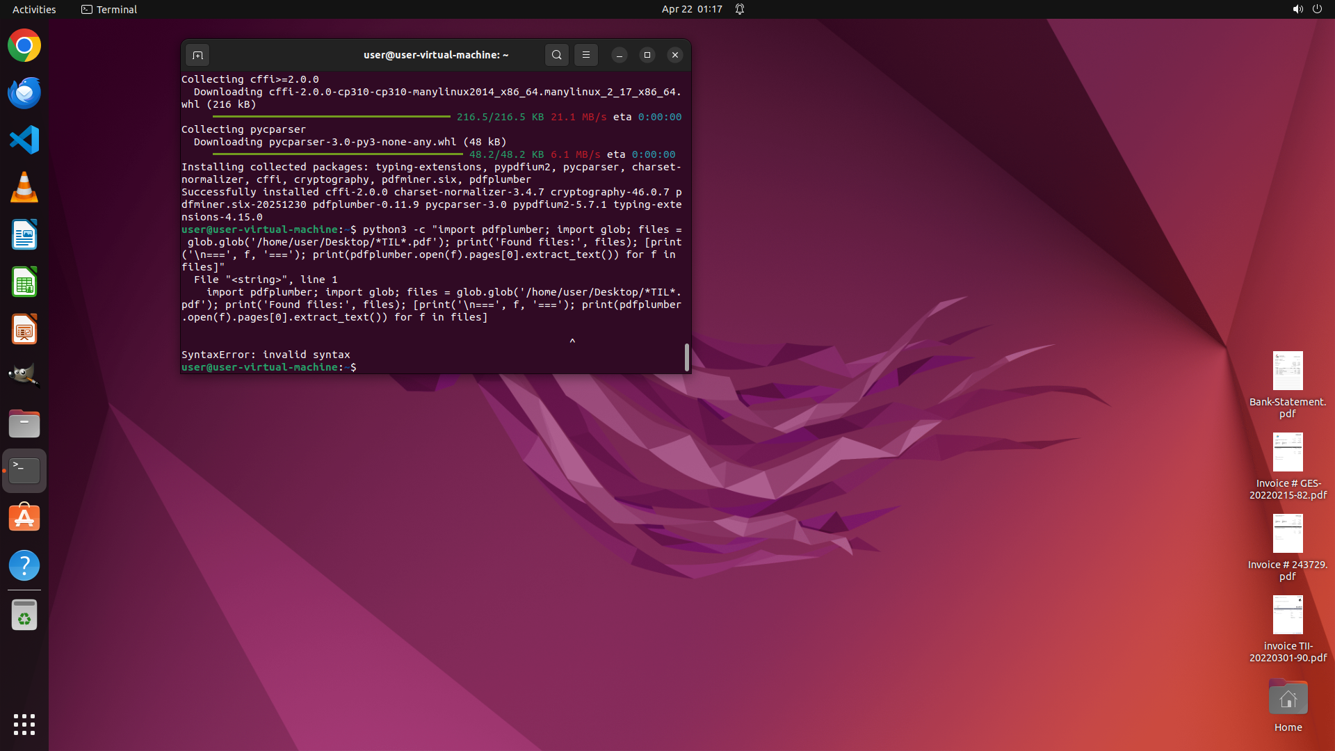pdfplumber 安装正在进行中,我需要等待安装完成。安装成功后,我就可以使用 Python 脚本来提取第三个发票(invoice TIL-20220301-90.pdf)的内容。