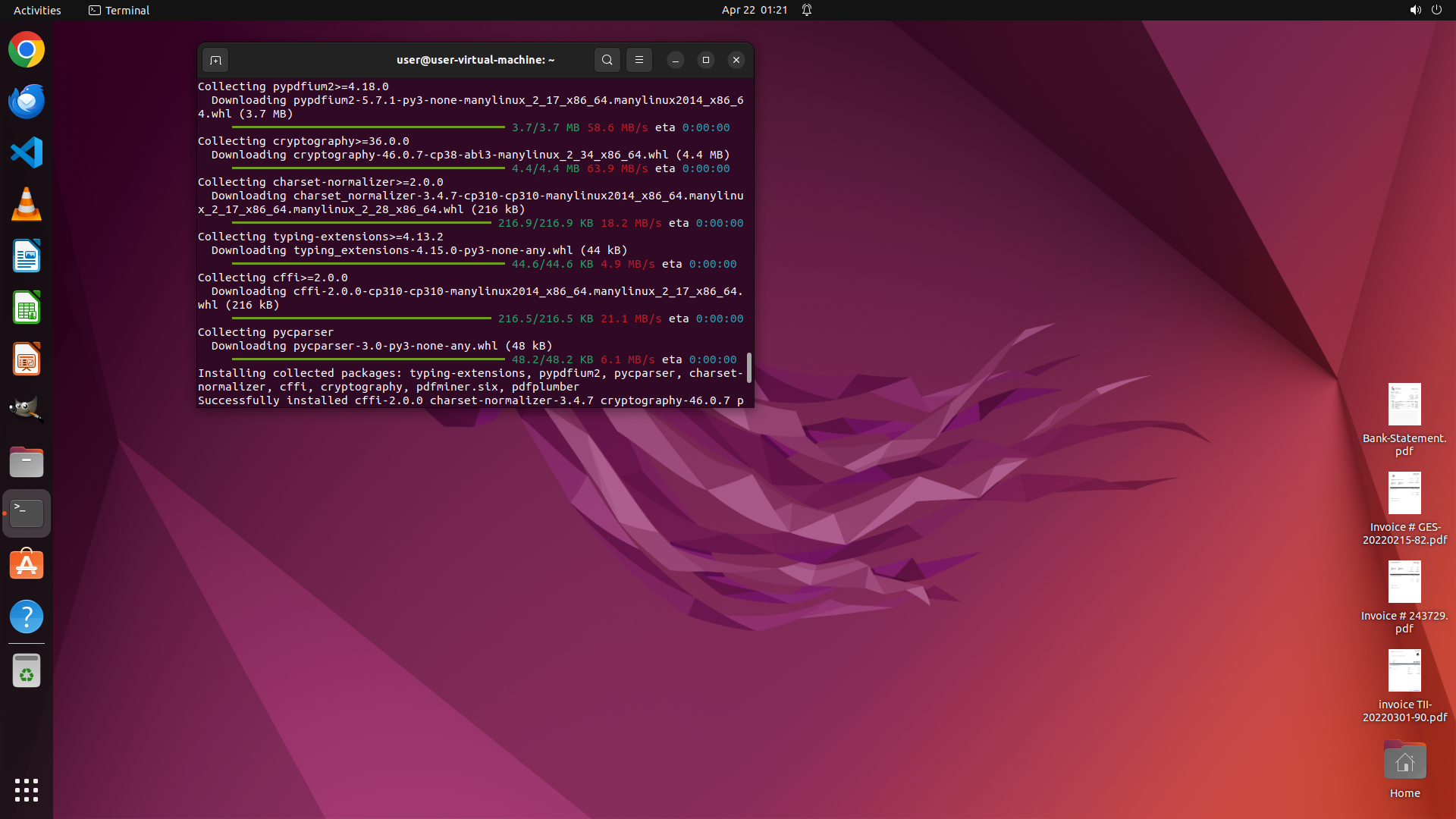 pdfplumber 安装正在进行中,我需要等待安装完成。安装成功后,我就可以使用 Python 脚本来提取第三个发票(invoice TIL-20220301-90.pdf)的内容。