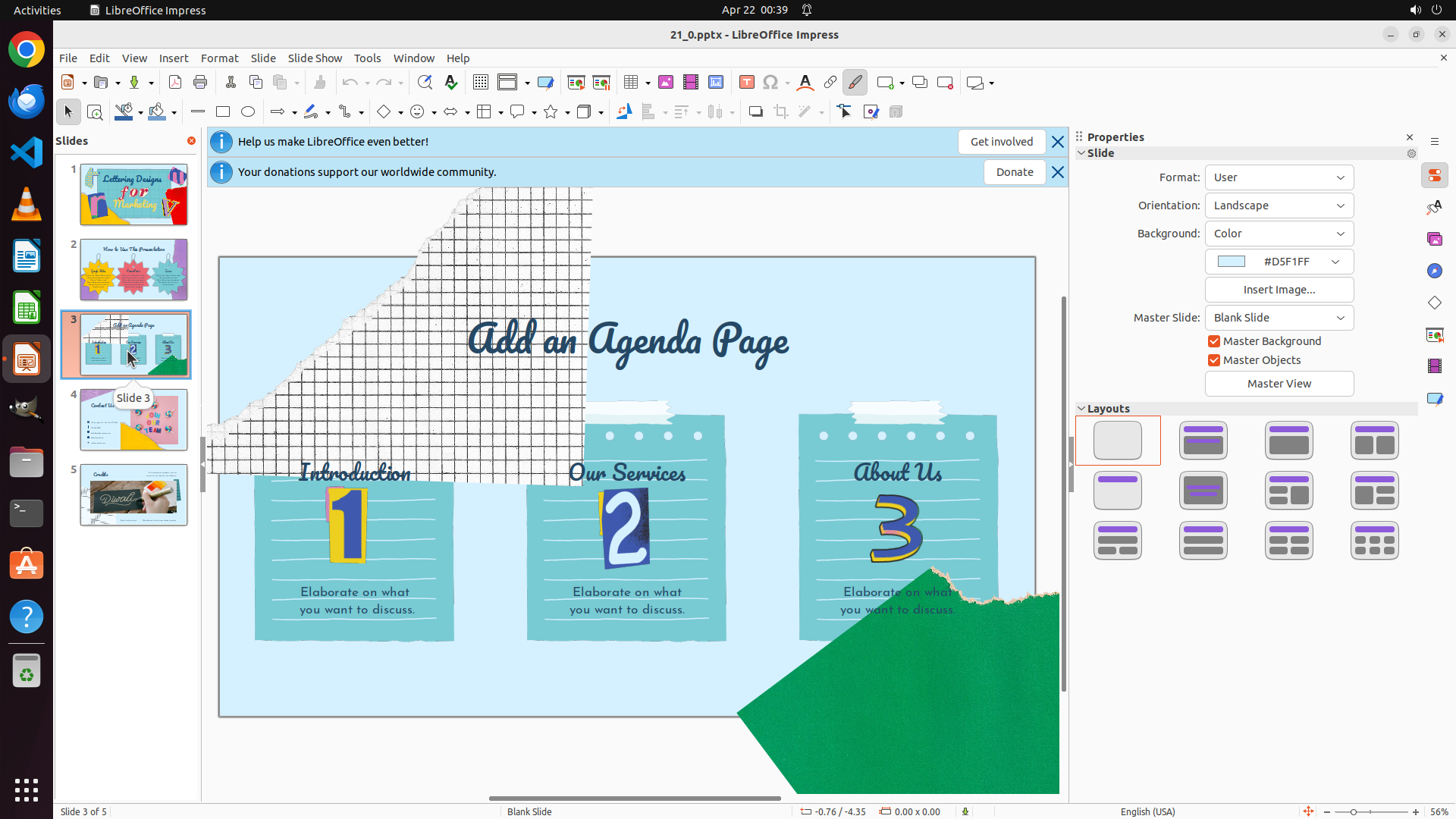 ## 4. 上一次操作的前 5 步操作简述 ### 步骤 1: - 描述: ``` #### 从截图中观察到的信息 当前屏幕显示的是 LibreOffice Impress 演示文稿,文件名为 "21_0.pptx"。目前显示的是第1张幻灯片("Lettering Designs for Marketing")。 左侧幻灯片面板显示了5张幻灯片的缩略图: - 幻灯片1:当前显示的标题页,彩色设计 - 幻灯片2:缩略图显示有星形图案和文字 - 幻灯片3:缩略图显示有图表/图形内容 - 幻灯片4:缩略图显示有联系信息和个人资料图标 - 幻灯片5:缩略图显示有图片内容 需要查看幻灯片2、3、4的详细内容来回答问题。目前只能看到缩略图,无法确定具体的标题文字、字体颜色、是否加粗等细节。 #### 下一步计划 1. 首先点击幻灯片2查看其详细内容,记录标题文字和内容 2. 然后查看幻灯片3的内容 3. 最后查看幻灯片4,识别需要删除的个人信息和图标 4. 在查看过程中注意标题的字体颜色和是否加粗 让我先点击幻灯片2来查看详细信息。 ``` 我将先查看幻灯片2的内容。 - 操作: 1. 左键单击坐标 (0.085, 0.329) </SITUATION>