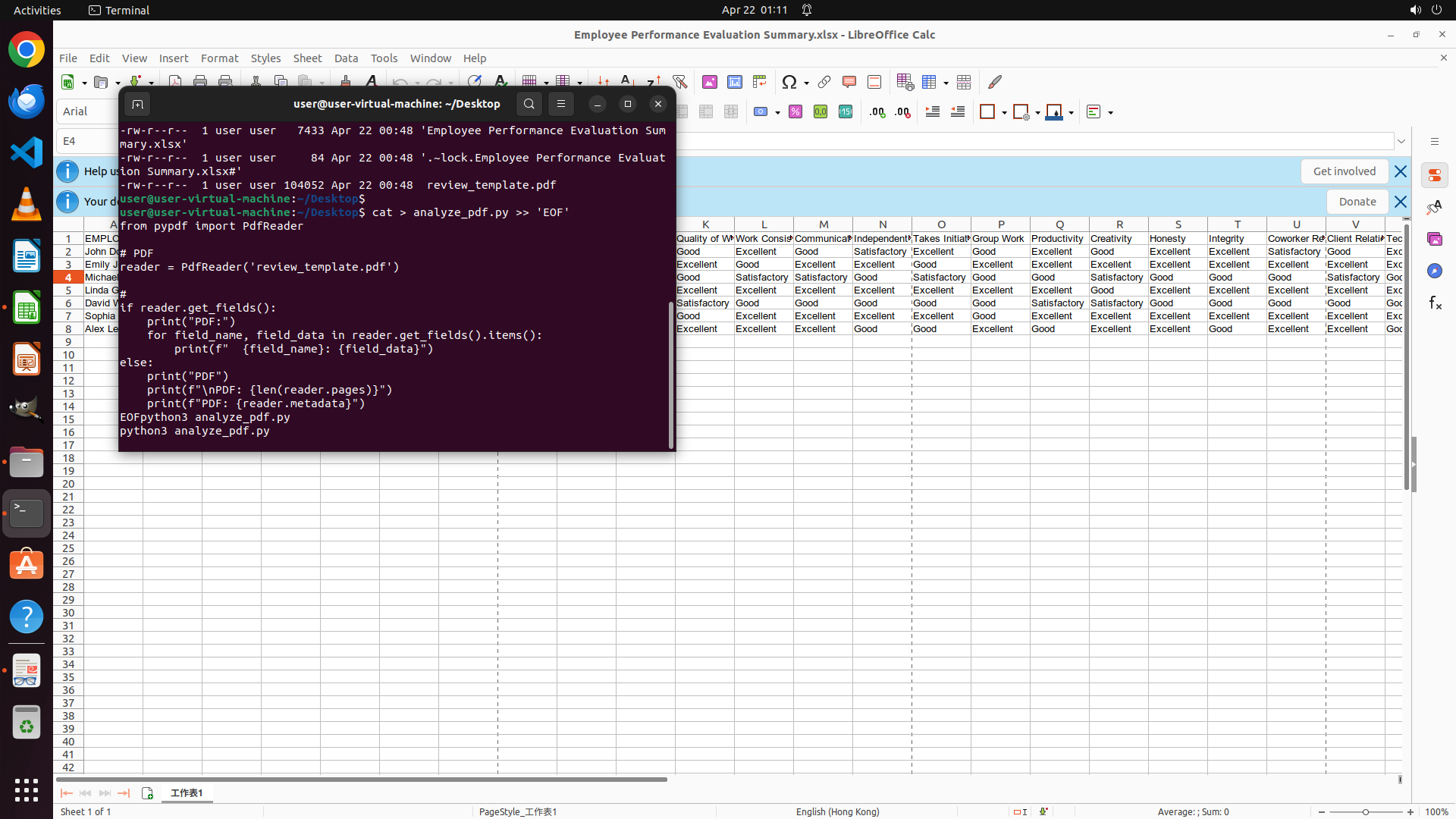 - LibreOffice Calc 正在显示 "Employee Performance Evaluation Summary.xlsx",包含7名员工数据(John Doe, Emily Johnson, Michael Brown, Linda Green, David Wilson, Sophia Carter, Alex Lee)
