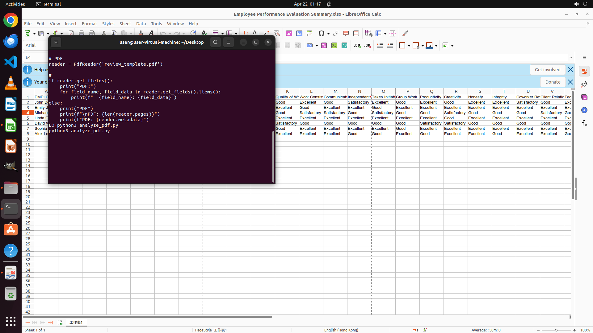 - LibreOffice Calc中显示Excel文件"Employee Performance Evaluation Summary.xlsx",包含7名员工数据