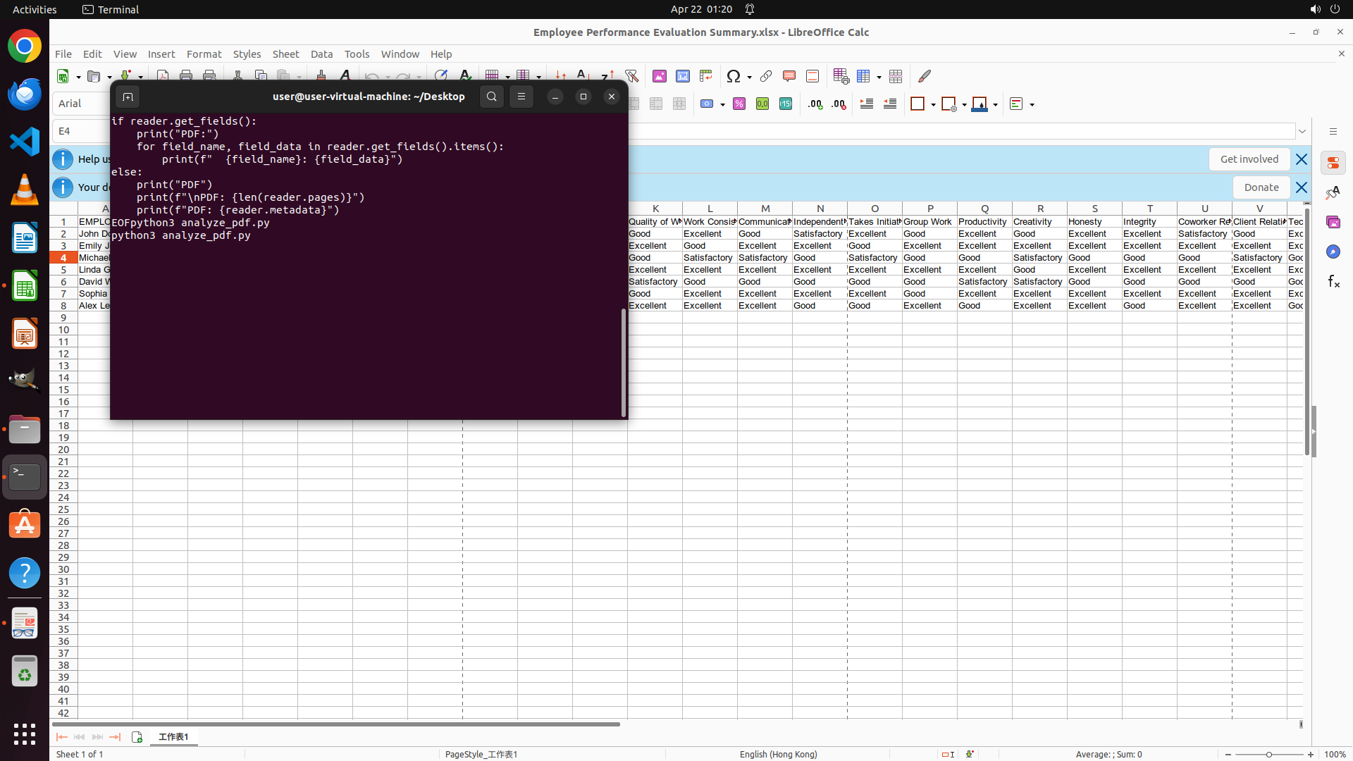 - LibreOffice Calc中显示Excel文件"Employee Performance Evaluation Summary.xlsx",包含7名员工数据(第2-8行)