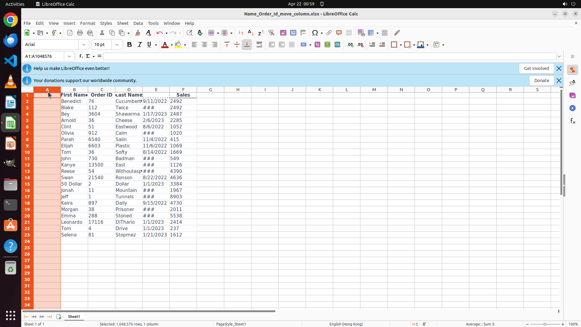你的任务是:借助工具,来操作一台电脑来达成任务: Reorder the columns to be "Date", "First Name", "Last Name", "Order ID", "Sales". Finish the work and don't touch irrelevant regions, even if they are blank.。
