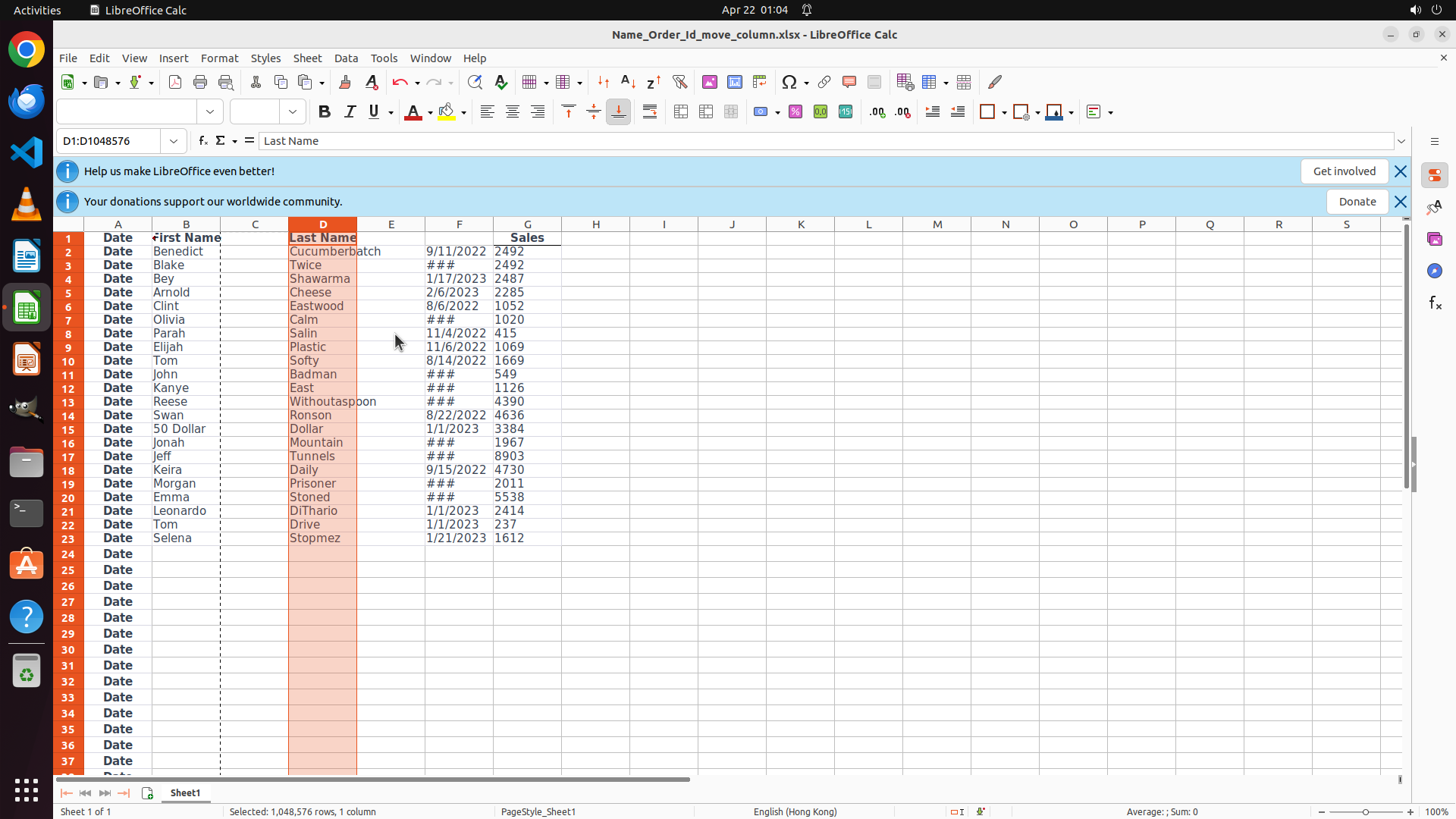你的任务是:借助工具,来操作一台电脑来达成任务: Reorder the columns to be "Date", "First Name", "Last Name", "Order ID", "Sales". Finish the work and don't touch irrelevant regions, even if they are blank.。