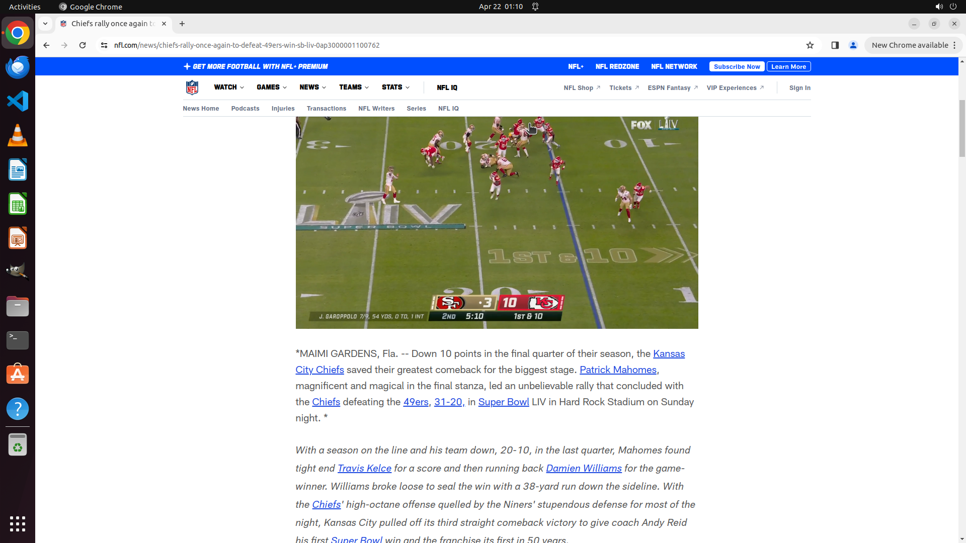 - 已成功访问 NFL.com 的 Super Bowl LIV 官方文章页面