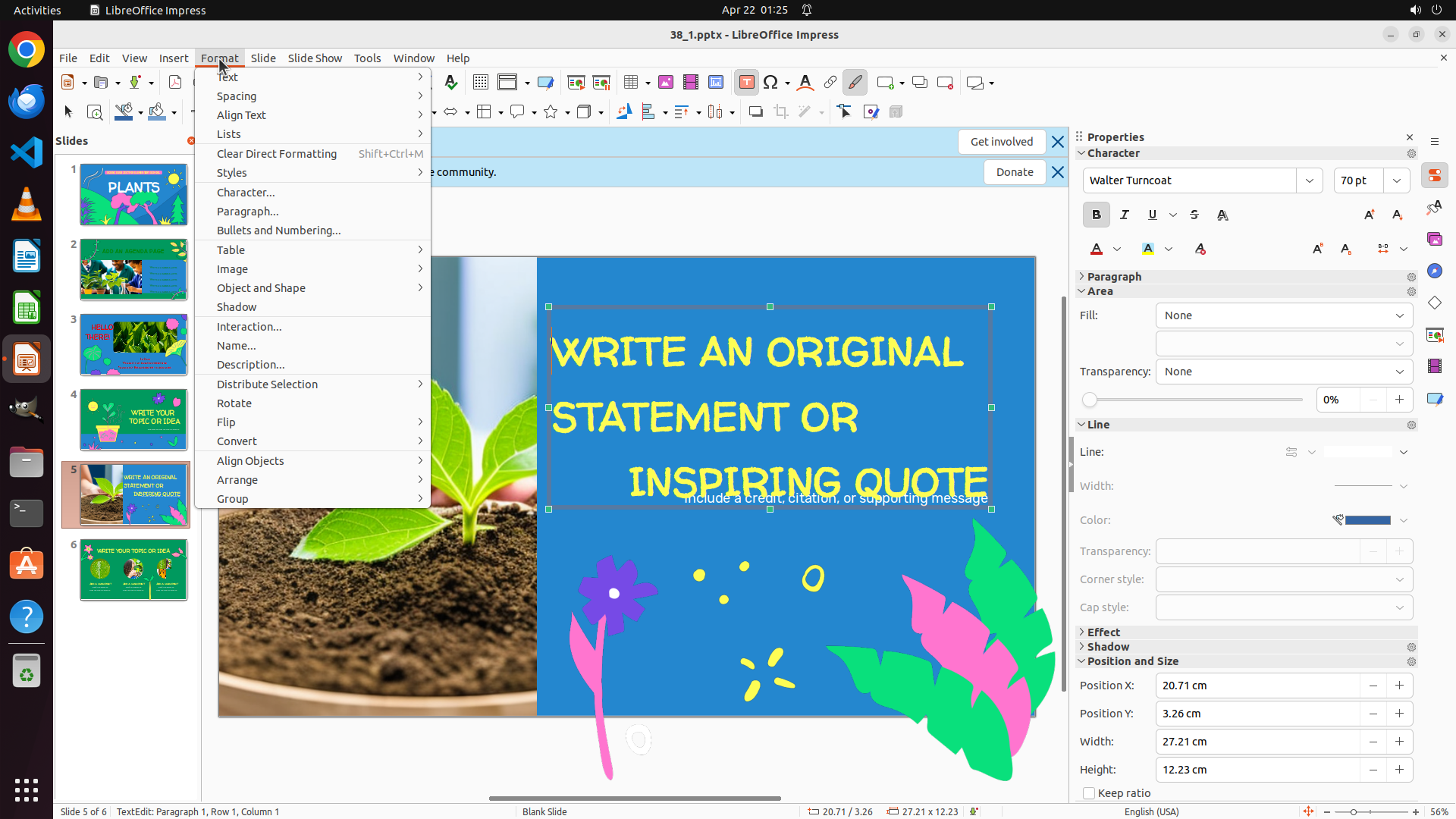 - The textbox on slide 5 is still selected (green selection handles visible)