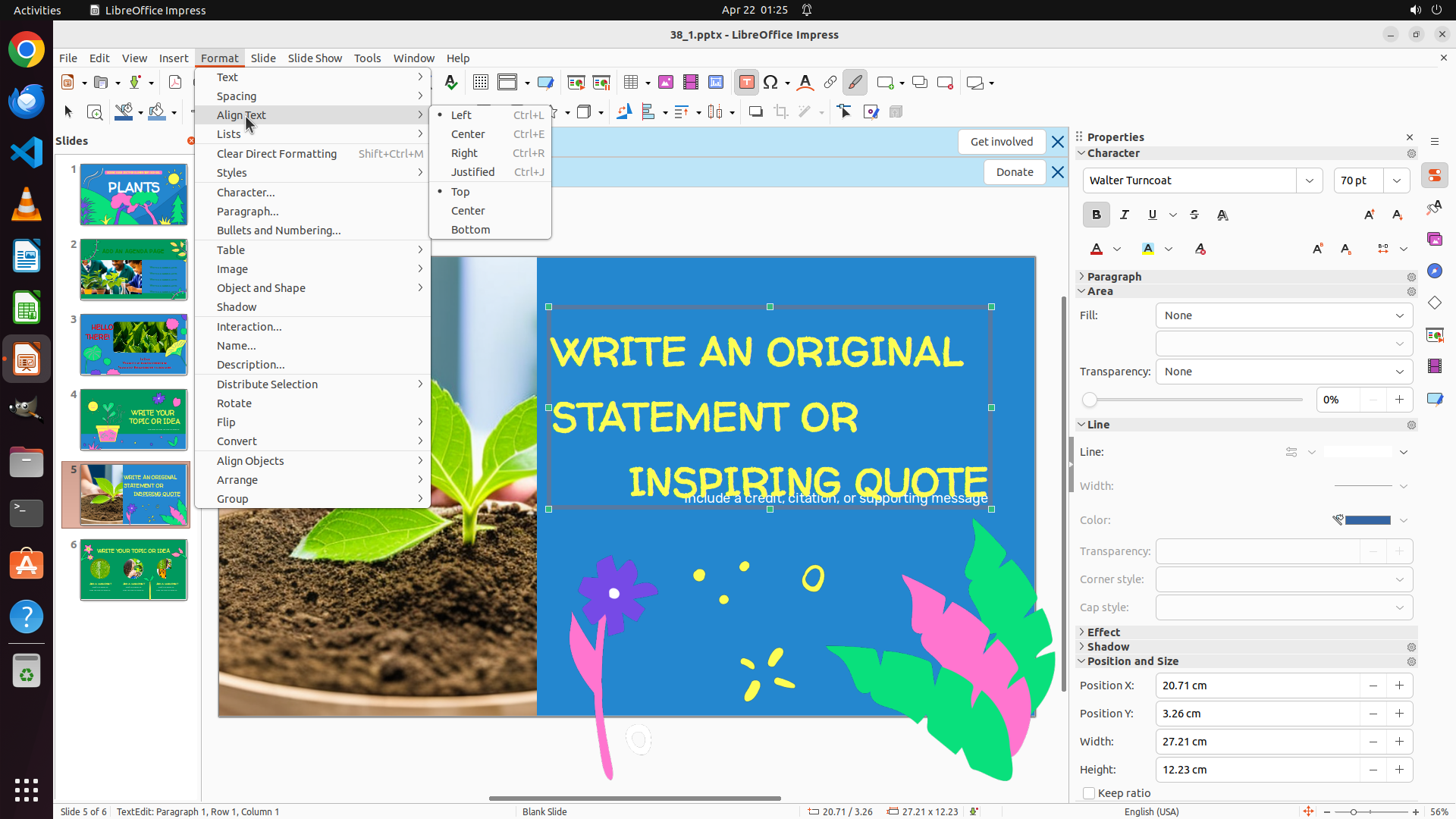 The previous attempt to click on "Left" in the Align Text submenu didn't successfully apply left alignment to the text. The text "WRITE AN ORIGINAL STATEMENT OR INSPIRING QUOTE" still appears center-aligned.