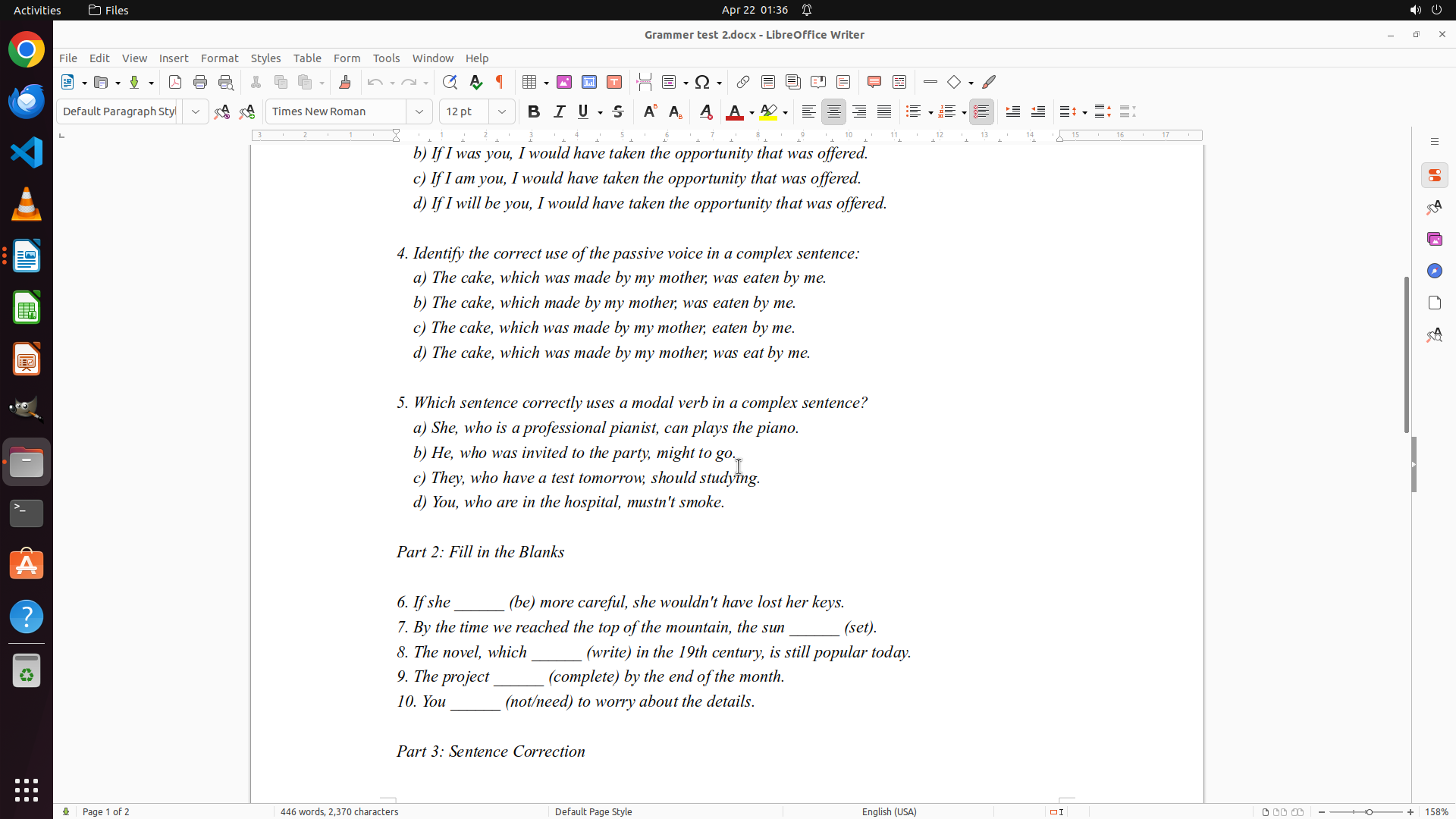 Grammar test 2.docx 已成功打开并显示在 LibreOffice Writer 中。我可以看到以下题目: