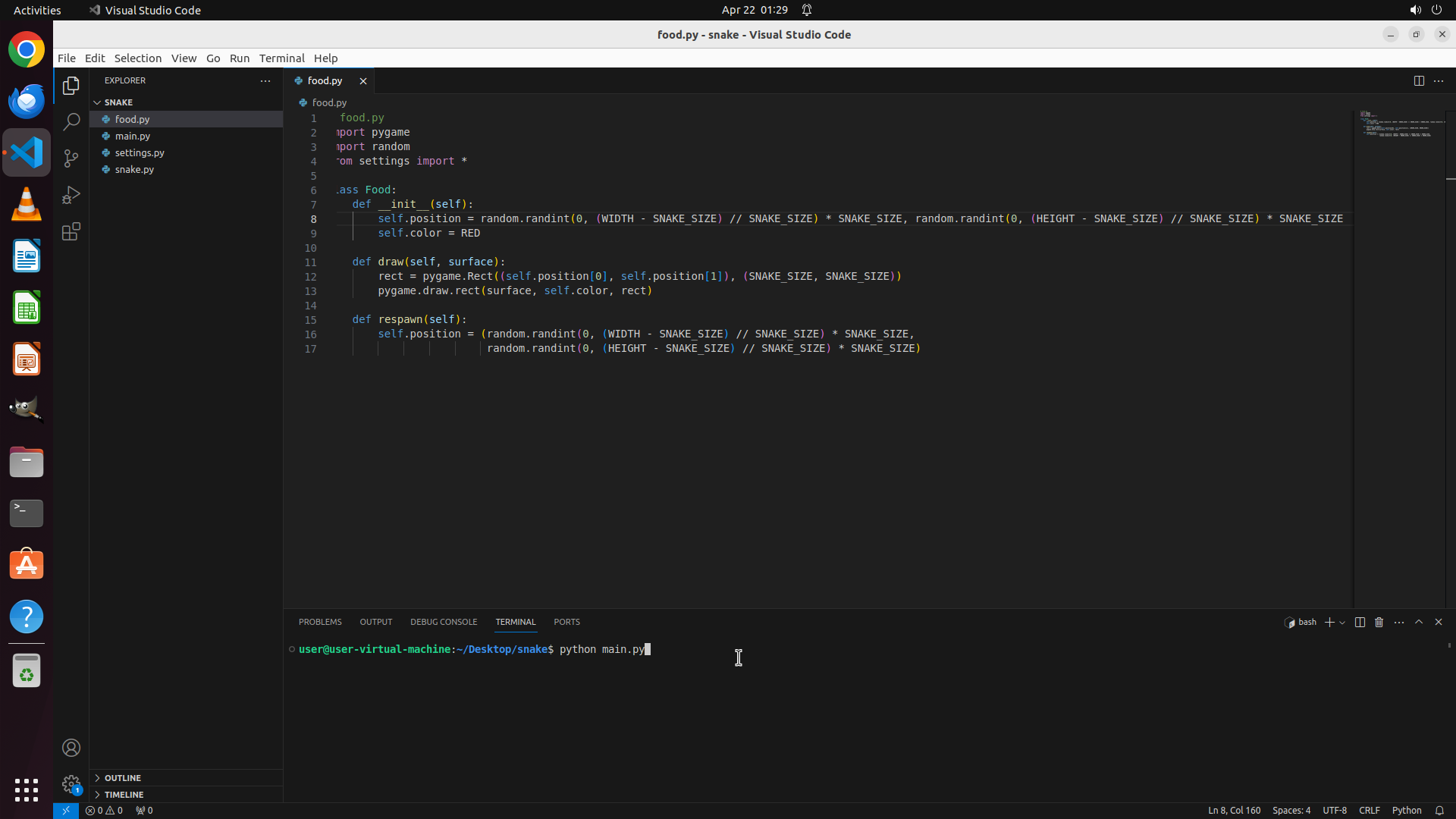你的任务是:借助工具,来操作一台电脑来达成任务: So, I've been dabbling with coding a Snake game in Python, and I finally got it up and running. It's pretty cool, but it's not without its quirks. The biggest issue I'm facing right now is that the snake can't seem to eat the food, no matter what. Could you help me tweak the code so the snake can actually eat the food? Thanks a bunch!。