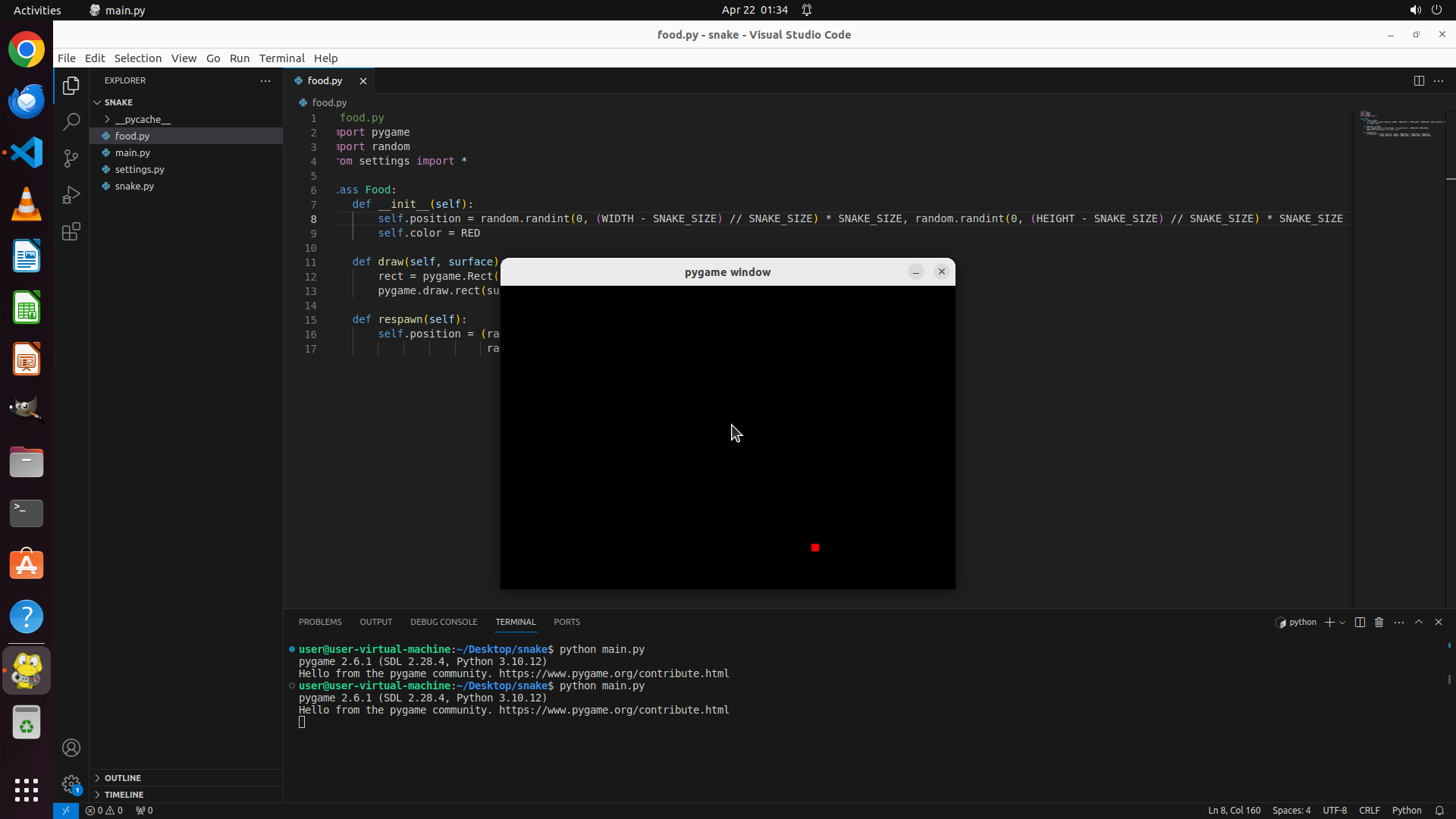 - Visual Studio Code: food.py 文件已修改并保存,第8行使用网格对齐的位置计算