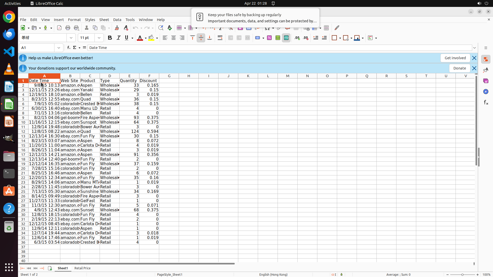 - The spreadsheet contains data with columns: Date Time (A), Web Site (B), Product (C), Type (D), Quantity (E), Discount (F)