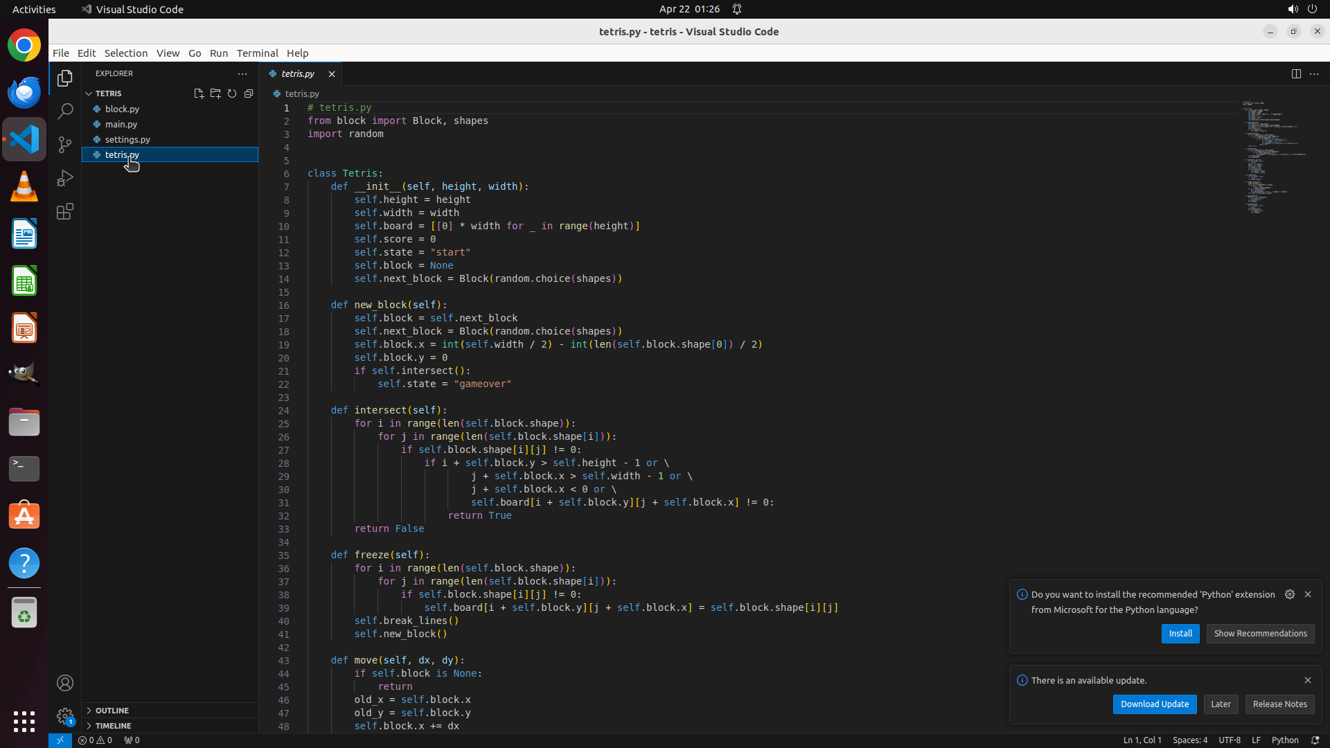 VS Code: 已打开,左侧资源管理器显示 TETRIS 项目文件夹,包含以下文件:
