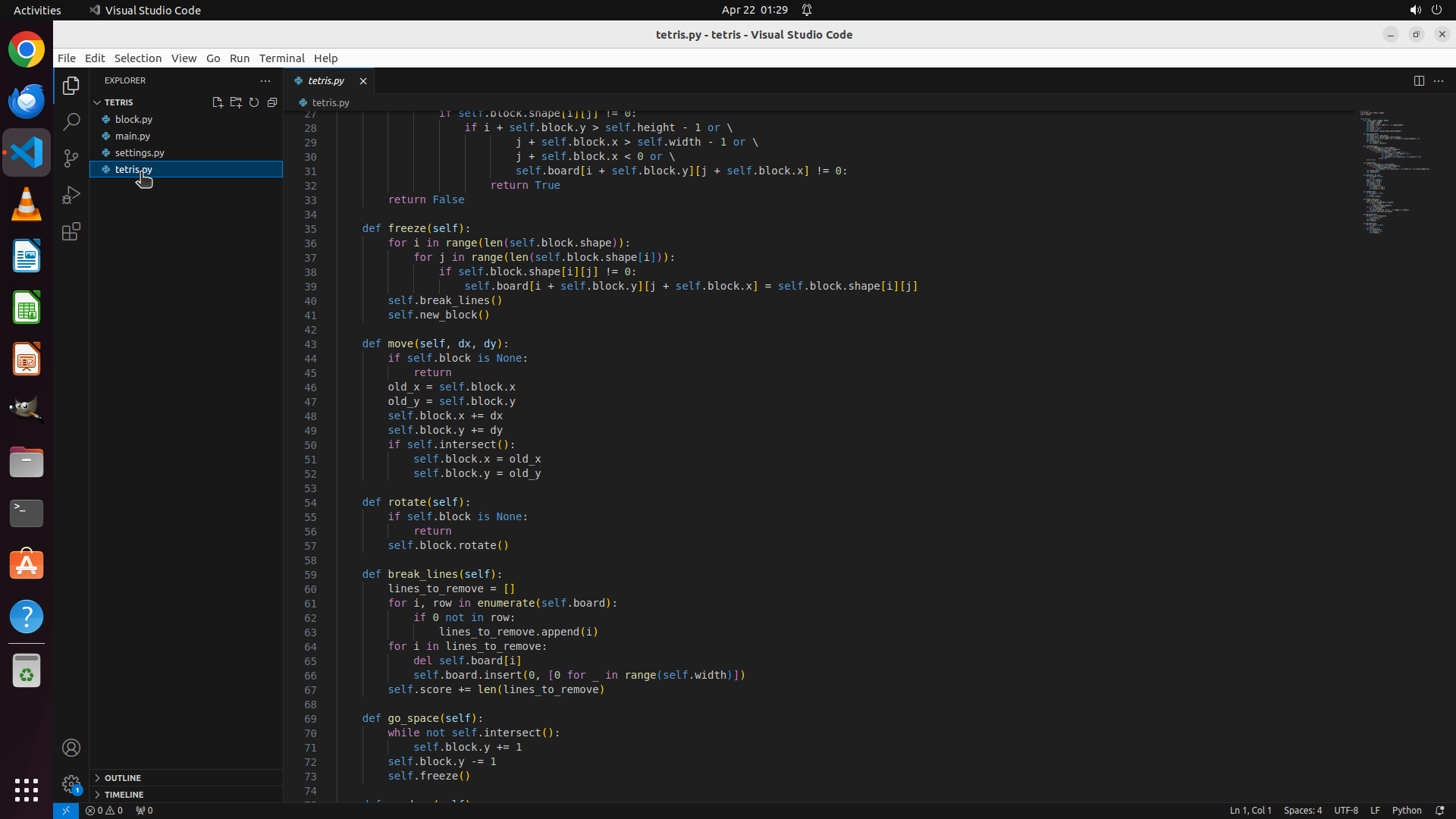 你的任务是:借助工具,来操作一台电脑来达成任务: Hi, I recently playing with developing a small python-based tetris game. While I have finished most of the part, something is wrong under some cases when I press up to rotate, the whole program will crash, please run the code for me and fix the bugs of code.。