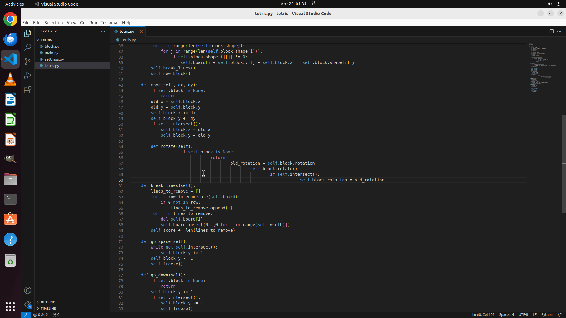 当前 VS Code: 已打开 tetris.py 文件,可以看到 rotate() 方法在第 54-58 行: