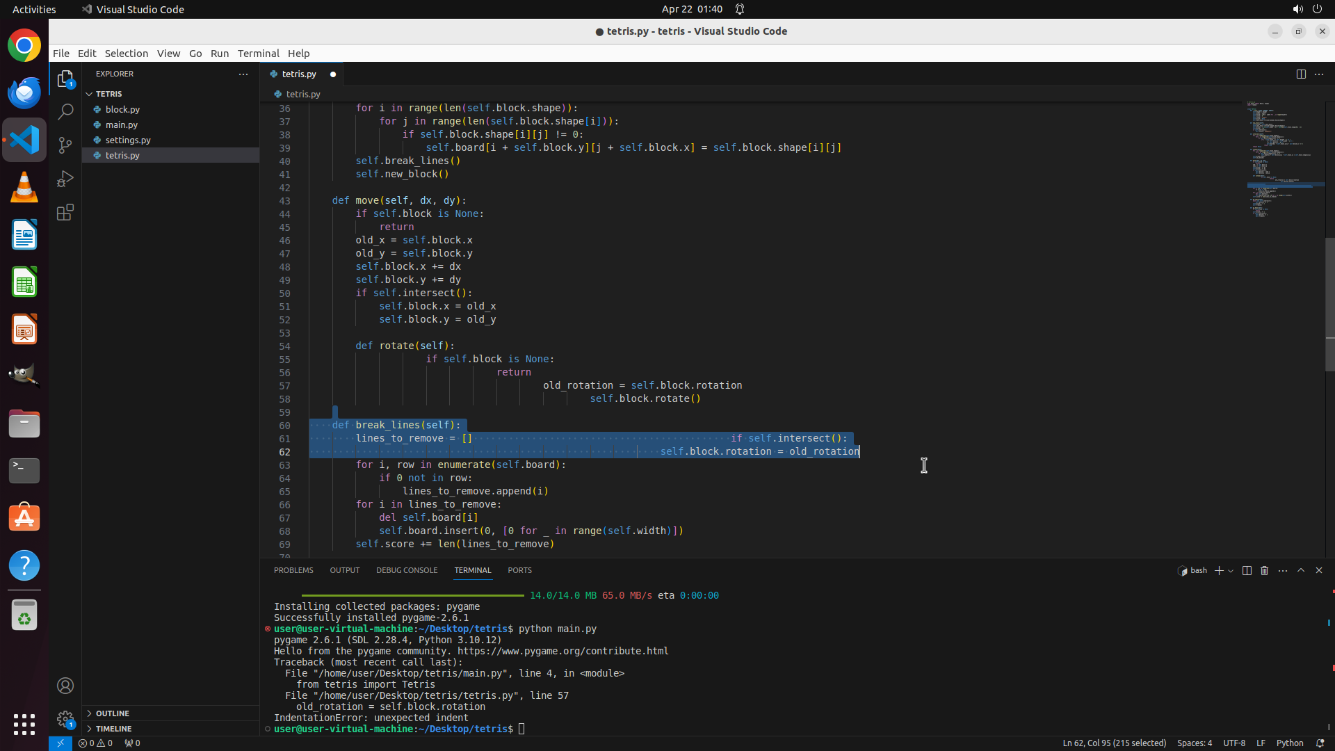 1. 选中第 57-60 行(缩进错误的代码,从 `old_rotation` 开始到 `self.block.rotation = old_rotation` 结束)