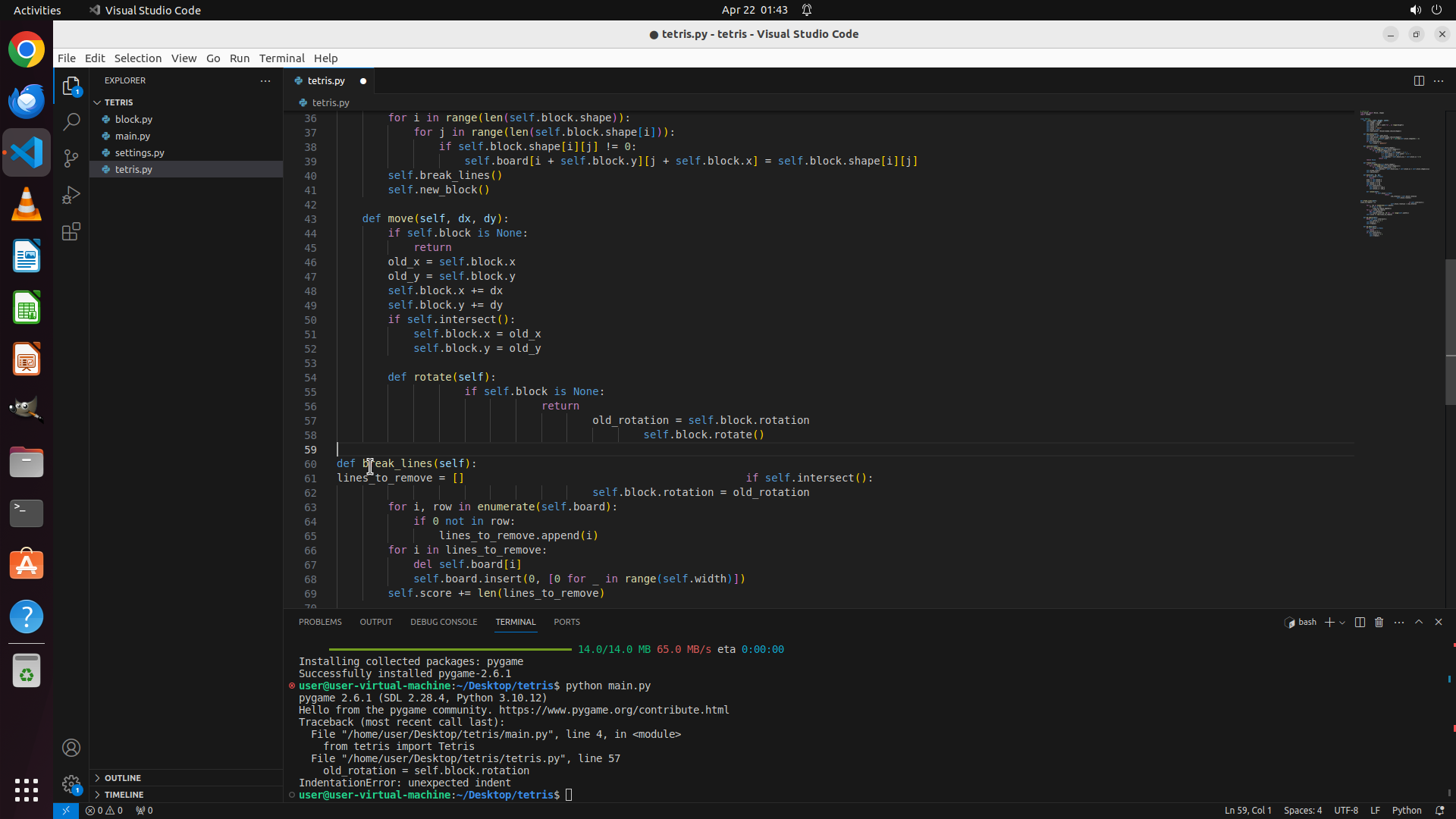 当前 VS Code: 已选中 tetris.py 文件中第57-60行的代码(蓝色高亮显示),这些代码存在缩进错误: