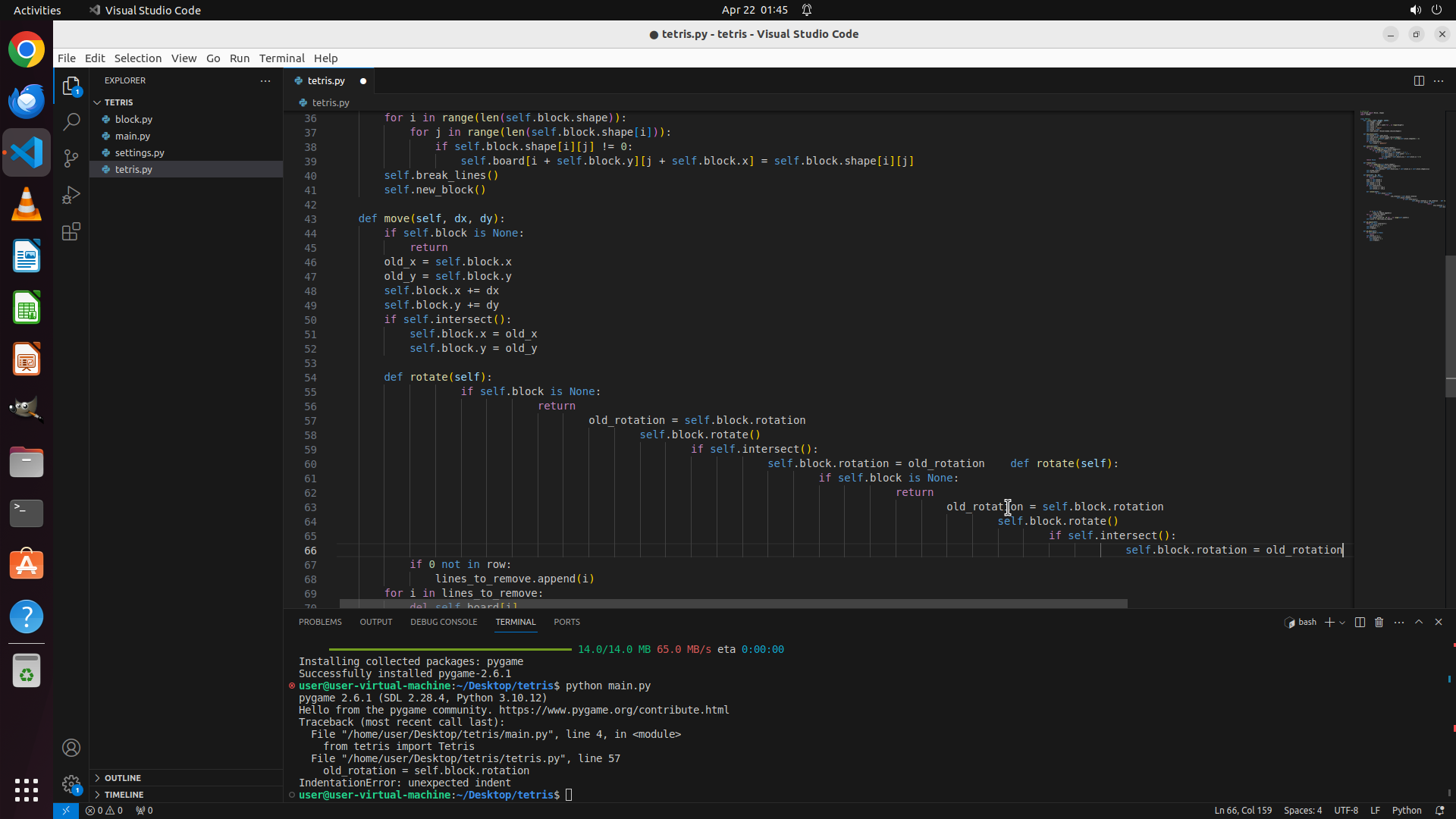 你的任务是:借助工具,来操作一台电脑来达成任务: Hi, I recently playing with developing a small python-based tetris game. While I have finished most of the part, something is wrong under some cases when I press up to rotate, the whole program will crash, please run the code for me and fix the bugs of code.。