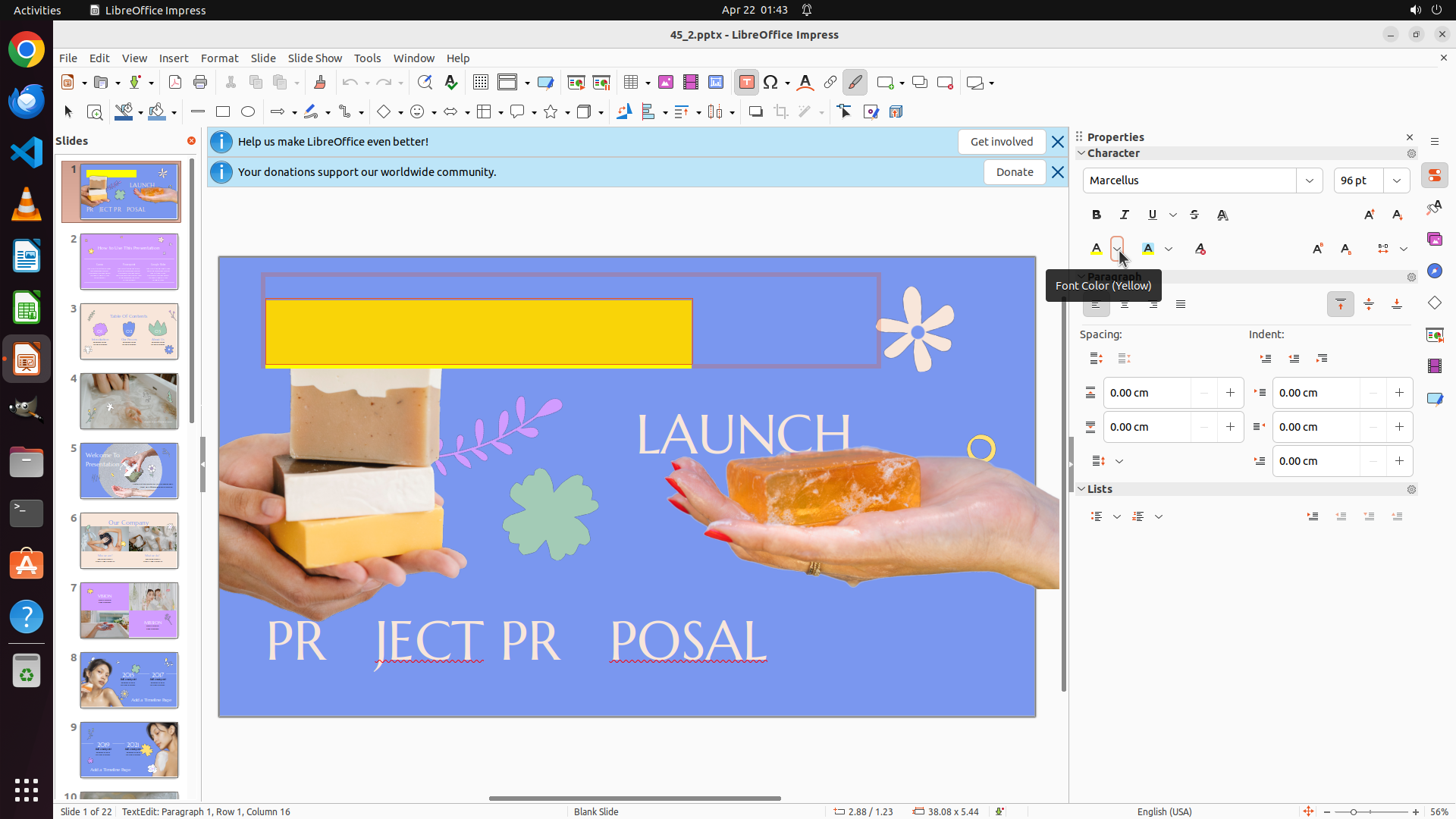 The latest screenshot shows LibreOffice Impress with slide 1 displayed. The Properties panel on the right shows "Character" properties. The text "NEW PR DUCT" in the top textbox is selected (highlighted in yellow with the cursor visible). The text currently has yellow background highlighting from previous actions, but the text color itself is still white/light.