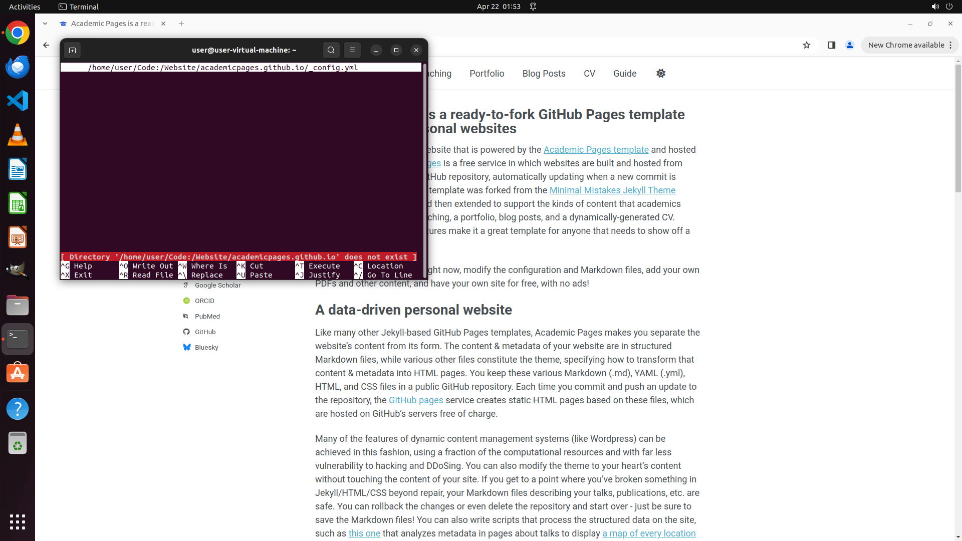 ## 6. 上一次操作的前50步操作简述 ### 步骤 1: - 描述: ``` #### 重要信息 - 终端窗口已打开,正在显示 _config.yml 文件的内容 - 当前视图显示的是文件中的社交媒体配置部分(foursquare, goodreads, google_plus 等) - 底部可以看到 "# Site Settings" 注释 - 需要向上滚动查找 name 和 email 字段,这些字段通常在文件顶部 #### 情况分析与思考过程 根据策略树,我需要: 1. 首先找到 _config.yml 文件中的 name 和 email 字段 2. 将 name 修改为 "Test Account" 3. 将 email 修改为 "[email protected]" 4. 保存文件 当前终端显示的是文件中间/底部的社交媒体配置部分。name 和 email 字段通常在 YAML 配置文件的顶部。我需要向上滚动来找到这些字段。从截图中可以看到终端正在显示文件内容,所以我应该先在终端中向上滚动来查找 name 和 email 字段。 接下来我将执行向上滚动操作来查看文件顶部的内容。 ``` - 操作: 1. 鼠标滚轮在坐标 (0.234, 0.278) 向上滚动,滚动量 10 ### 步骤 2: - 描述: ``` #### 重要信息 - 终端窗口已打开,正在显示 _config.yml 文件的内容 - 成功向上滚动后,现在可以看到文件顶部的关键字段: - `name: "Your Sidebar Name"` - 这是需要修改的姓名字段 - `email: "[email protected]"` - 这是需要修改的邮箱字段 - 还有其他字段如 avatar, bio, location, employer 等 - 当前只是用 `cat` 命令查看文件内容,需要用文本编辑器来修改文件 #### 情况分析与思考过程 现在我已经找到了 name 和 email 字段的位置和当前值: - name: "Your Sidebar Name" → 需要改为 "Test Account" - email: "[email protected]" → 需要改为 "[email protected]" 接下来我需要: 1. 使用文本编辑器(如 nano 或 vim)打开 _config.yml 文件 2. 找到并修改 name 字段 3. 找到并修改 email 字段 4. 保存文件 我应该在终端中使用 nano 编辑器来打开并编辑这个文件,因为 nano 对新手更友好。首先需要点击终端窗口确保它处于焦点状态,然后输入 nano 命令打开文件。 - 操作: 1. 左键单击坐标 (0.234, 0.278) 2. 输入文本: nano ~/Code:/Website/_config.yml ### 步骤 3: - 描述: ``` #### 重要信息 - 终端窗口已打开,显示 _config.yml 文件的内容(使用 cat 命令查看的) - 命令行底部已经输入了 `nano ~/Code:/Website/_config.yml` 命令 - 当前还没有执行该命令,nano 编辑器尚未打开 - 之前已经确认了 name 字段为 "Your Sidebar Name",email 字段为 "[email protected]" #### 情况分析与思考过程 现在我需要执行已经输入的 nano 命令来打开 _config.yml 文件进行编辑。我需要按 Enter 键来执行这个命令。一旦 nano 编辑器打开,我就可以: 1. 使用方向键找到 name 字段 2. 修改 name 为 "Test Account" 3. 找到 email 字段 4. 修改 email 为 "[email protected]" 5. 保存文件(Ctrl+O 然后 Enter,再 Ctrl+X 退出) 让我先按 Enter 执行 nano 命令。 ``` - 操作: 1. 按下键盘按键: enter ### 步骤 4: - 描述: ``` #### 重要信息 - nano 编辑器尝试打开文件时出现了错误 - 错误信息显示:"Directory '/home/user/Code:/Website' does not exist" - 这意味着 ~/Code:/Website 这个路径不存在或路径有误 - 需要退出 nano 并找到正确的文件路径 #### 情况分析与思考过程 看起来用户提到的路径 `~/Code:/Website` 可能不正确,或者该目录不存在。我需要: 1. 先退出 nano(按 Ctrl+X) 2. 然后查找正确的路径,可能需要查看 ~/Code: 目录下的内容 3. 找到正确的 _config.yml 文件位置后再用 nano 打开 让我先退出 nano,然后探索正确的文件路径。 ``` 我将退出 nano 并查找正确的文件路径。 - 操作: 1. 按下键盘按键: ctrl, x ### 步骤 5: - 描述: - 操作: 1. 输入文本: find ~ -name "_config.yml" 2>/dev/null 2. 按下键盘按键: enter ### 步骤 6: - 描述: ``` #### 重要信息 - 终端窗口显示 find 命令已成功执行 - 找到了 _config.yml 文件的正确路径:`/home/user/Code:/Website/academicpages.github.io/_config.yml` - 之前尝试的路径 `~/Code:/Website/_config.yml` 是错误的,正确的路径在 academicpages.github.io 子目录下 - 当前终端处于命令行状态,可以输入新的命令 #### 情况分析与思考过程 现在我已经找到了正确的文件路径。接下来我需要: 1. 使用 nano 编辑器打开正确的文件路径:`~/Code:/Website/academicpages.github.io/_config.yml` 2. 找到 name 字段(之前看到是 "Your Sidebar Name")并改为 "Test Account" 3. 找到 email 字段(之前看到是 "[email protected]")并改为 "[email protected]" 4. 保存文件并退出 让我点击终端窗口并输入 nano 命令来打开正确的文件。 ``` 我将使用 nano 编辑器打开找到的正确文件路径。 - 操作: 1. 左键单击坐标 (0.234, 0.278) 2. 输入文本: nano ~/Code:/Website/academicpages.github.io/_config.yml 3. 按下键盘按键: enter ### 步骤 7: - 描述: - 操作: 1. 按下键盘按键: ctrl, x ### 步骤 8: - 描述: ``` #### 重要信息 - 终端当前处于命令行状态,nano 编辑器已被退出(通过之前的 Ctrl+X) - 文件正确路径已确认:`/home/user/Code:/Website/academicpages.github.io/_config.yml` - 需要重新打开 nano 编辑器来修改 name 和 email 字段 - 之前已确认 name 字段值为 "Your Sidebar Name",email 字段值为 "[email protected]" #### 情况分析与思考过程 根据策略树状态,步骤 1.1 和 1.2 已完成(找到了字段位置),现在需要执行步骤 2 和 3 来实际修改文件。 我的计划: 1. 重新使用 nano 打开正确的文件路径 2. 找到 name 字段并改为 "Test Account" 3. 找到 email 字段并改为 "[email protected]" 4. 保存文件(Ctrl+O)并退出(Ctrl+X) 由于当前在命令行状态,我需要先输入 nano 命令打开文件。我将点击终端确保焦点,然后输入命令。 ``` - 操作: 1.