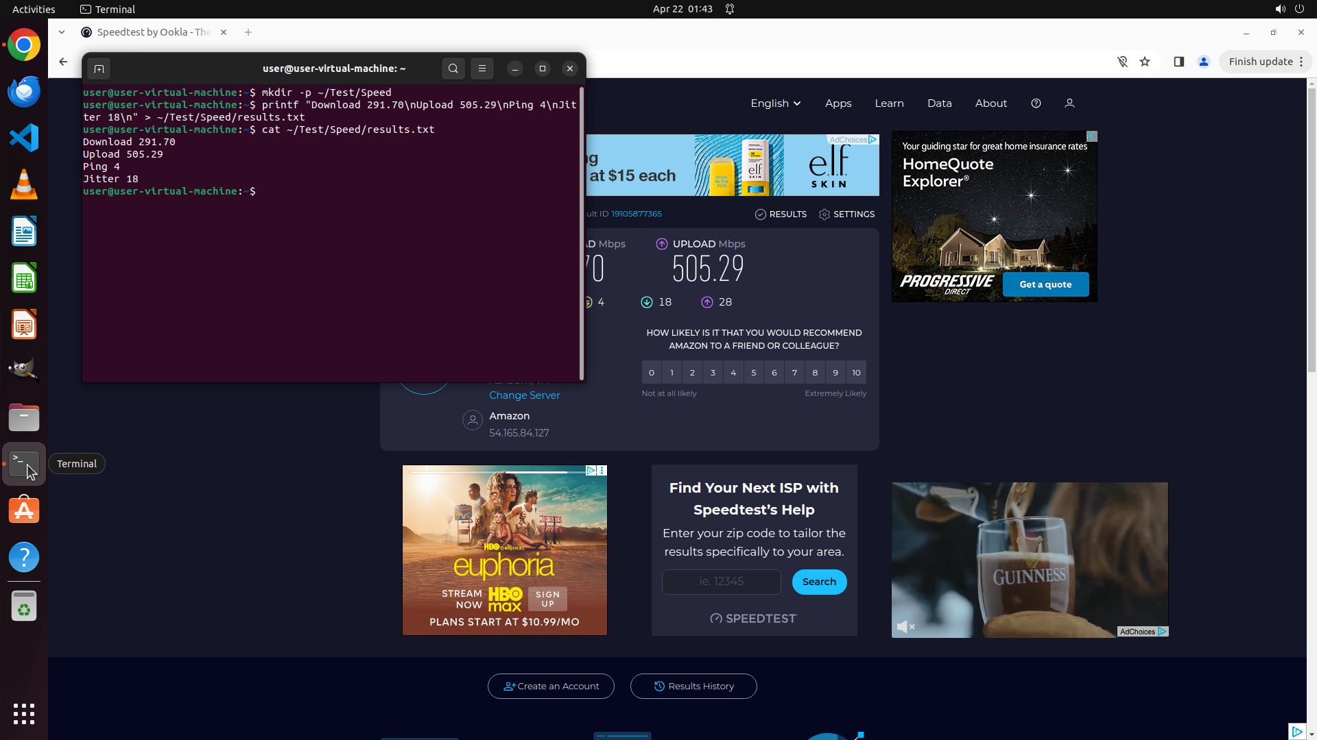 3. 输入文本: printf "Download 291.70\nUpload 505.29\nPing 4\nJitter 18\n" > ~/Test/Speed/results.txt