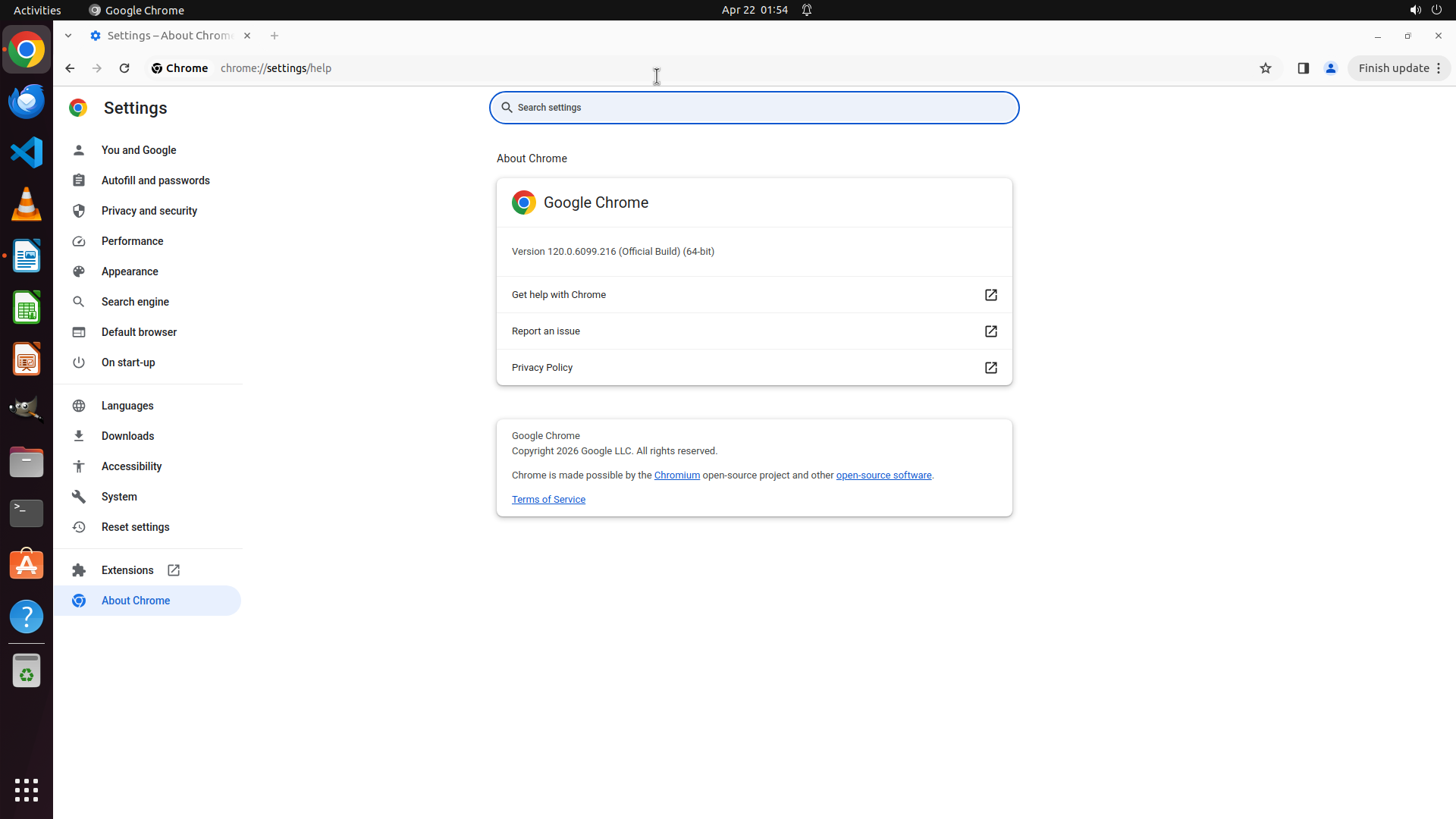 ## 6. 上一次操作的前50步操作简述 ### 步骤 1: - 描述: ``` #### 重要信息 当前屏幕显示 Google Chrome 浏览器已打开,但当前页面是 Chrome 设置页面的"About Chrome"部分(chrome://settings/help)。浏览器版本为 120.0.6099.216。左侧边栏显示了设置菜单选项,包括 Extensions(扩展程序)选项。 #### 情况分析与思考过程 任务要求安装朋友推荐的一系列 Chrome 插件。根据策略树,我需要: 1. 首先导航到 Chrome Web Store(chrome.google.com/webstore) 2. 找到推荐的插件列表 3. 安装每个插件 4. 验证安装 当前 Chrome 已打开,但在设置页面。我需要导航到 Chrome Web Store。最快捷的方法是点击地址栏并输入 Chrome Web Store 的 URL。 我将执行以下操作: - 点击地址栏(当前显示 chrome://settings/help) - 输入 Chrome Web Store URL - 按 Enter 导航 ``` - 操作: 1. 左键单击坐标 (0.5, 0.081) 2. 输入文本: chrome.google.com/webstore 3. 按下键盘按键: enter ### 步骤 2: - 描述: ``` #### 重要信息 当前屏幕上出现了一个"Back Up"备份对话框,这不是预期的Chrome Web Store页面。这个对话框显示"Folders to Back Up"和"Folders to Ignore"选项,有Cancel和Forward按钮。Chrome浏览器窗口在对话框后面,仍然显示About Chrome设置页面。 #### 情况分析与思考过程 之前的操作意图是点击地址栏并输入Chrome Web Store的URL,但似乎点击位置有误,可能点击到了桌面上的备份应用程序图标,导致打开了备份对话框。 为了继续任务,我需要: 1. 首先关闭这个备份对话框(点击Cancel按钮) 2. 然后重新尝试导航到Chrome Web Store 3. 找到朋友推荐的插件列表 4. 安装所有推荐的插件 当前最紧迫的是关闭这个干扰对话框,让我能够继续操作Chrome浏览器。 ``` - 操作: 1. 左键单击坐标 (0.152, 0.093) </SITUATION>