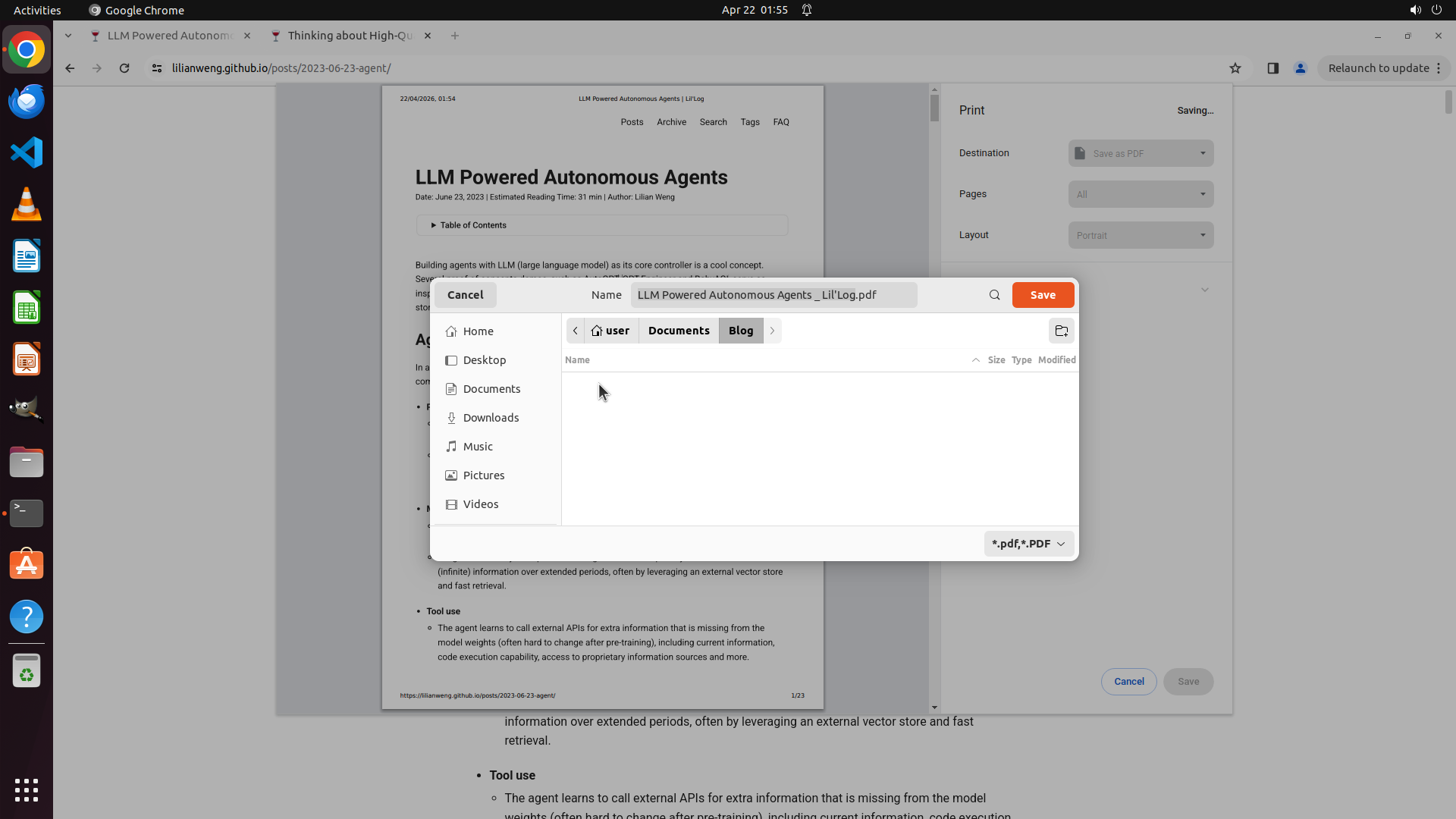 任务目标是将两个打开的博客文章保存为 PDF 到 /home/user/Documents/Blog,并使用文章标题作为文件名。