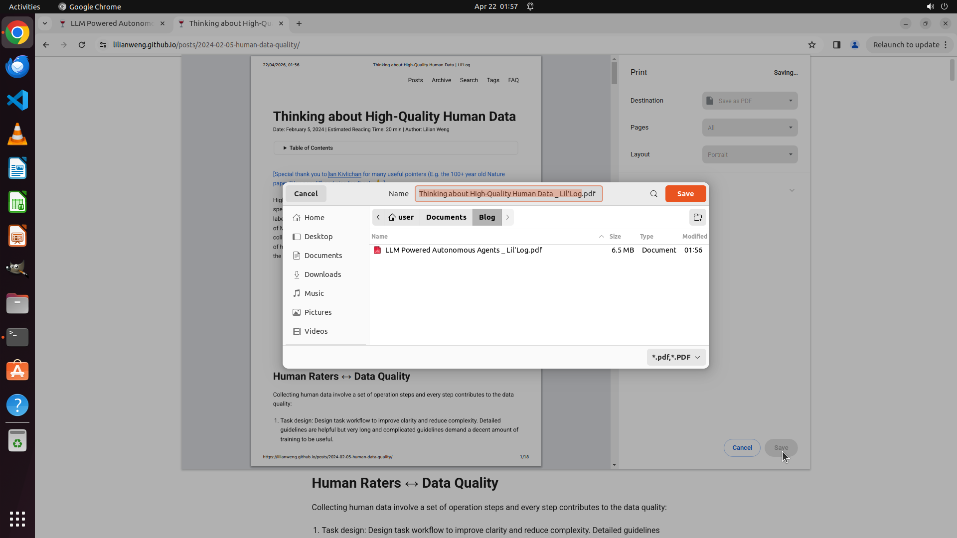 你的任务是:借助工具,来操作一台电脑来达成任务: I browsed a lot of interesting blog articles today. I hope to store these articles in my local designated folder just like zotero stores papers. Please download the blogs opening now in pdf format and save them in their title to /home/user/Documents/Blog.。