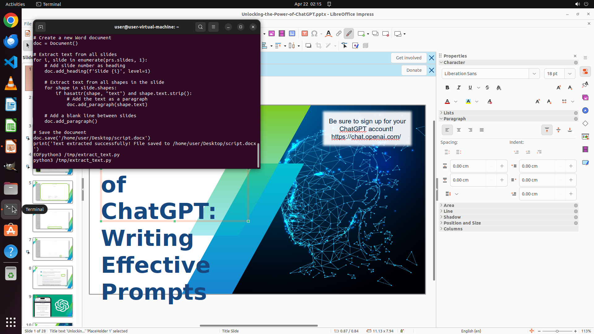 3. LibreOffice Impress 在后台运行,显示演示文稿 "Unlocking-the-Power-of-ChatGPT.pptx"