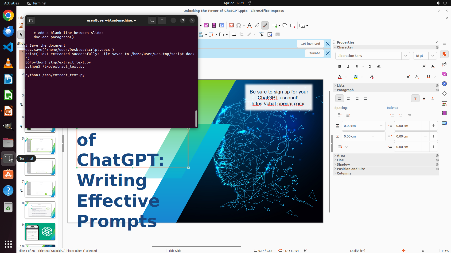 3. LibreOffice Impress 在后台运行,显示演示文稿 "Unlocking-the-Power-of-ChatGPT.pptx"