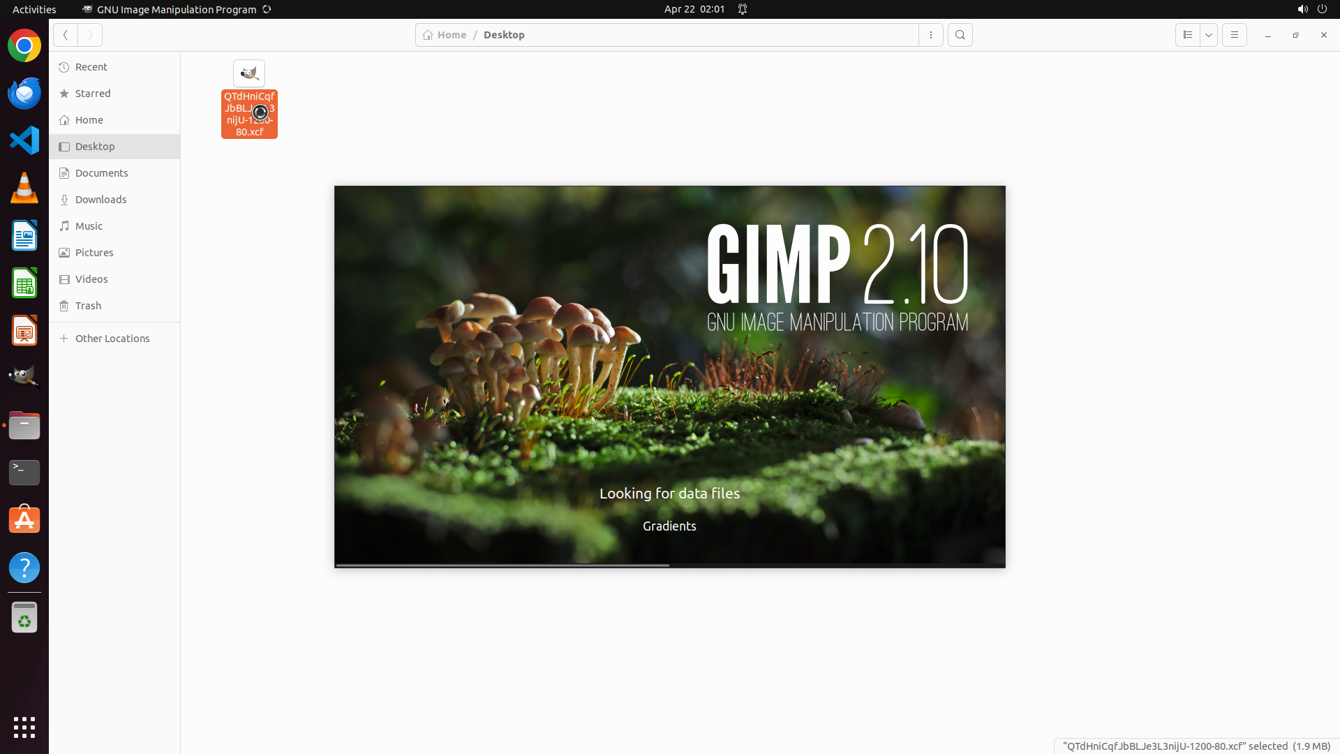 当前文件管理器已打开,显示Desktop文件夹内容。可以看到.xcf文件"OTdHniCqfJbBLe3L3nijU-1200-80.xcf"已经被选中(橙色高亮显示)。文件大小为1.9MB。任务需要将此文件中的图像复制到LibreOffice Writer文档中并保存为image.docx。
