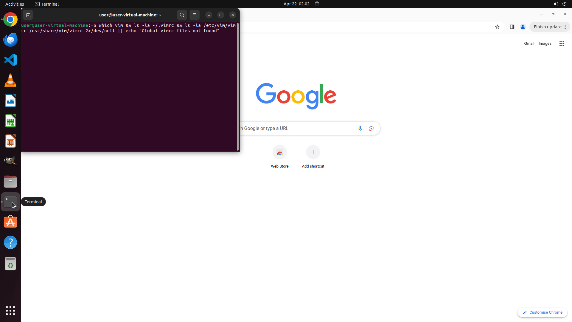 ## 4. 上一次操作的前 5 步操作简述 ### 步骤 1: - 描述: ``` #### 从截图中观察到的信息 当前屏幕显示 Google Chrome 浏览器已打开,显示 Google 搜索主页。左侧有一个垂直的 Ubuntu 应用启动栏(dock),包含多个应用程序图标。我可以看到一个终端图标(黑色/深色图标)在启动栏中。 目前还没有获得任何关于 Vim 安装状态或配置文件的信息,需要通过终端命令来检查。 #### 下一步计划 1. 点击终端图标打开终端窗口 2. 在终端中执行命令检查 Vim 是否已安装 3. 检查 ~/.vimrc 文件是否存在 4. 根据结果决定是否需要检查全局配置文件 我将首先点击终端图标来打开终端。 ``` - 操作: 1. 左键单击坐标 (0.018, 0.623) </SITUATION>