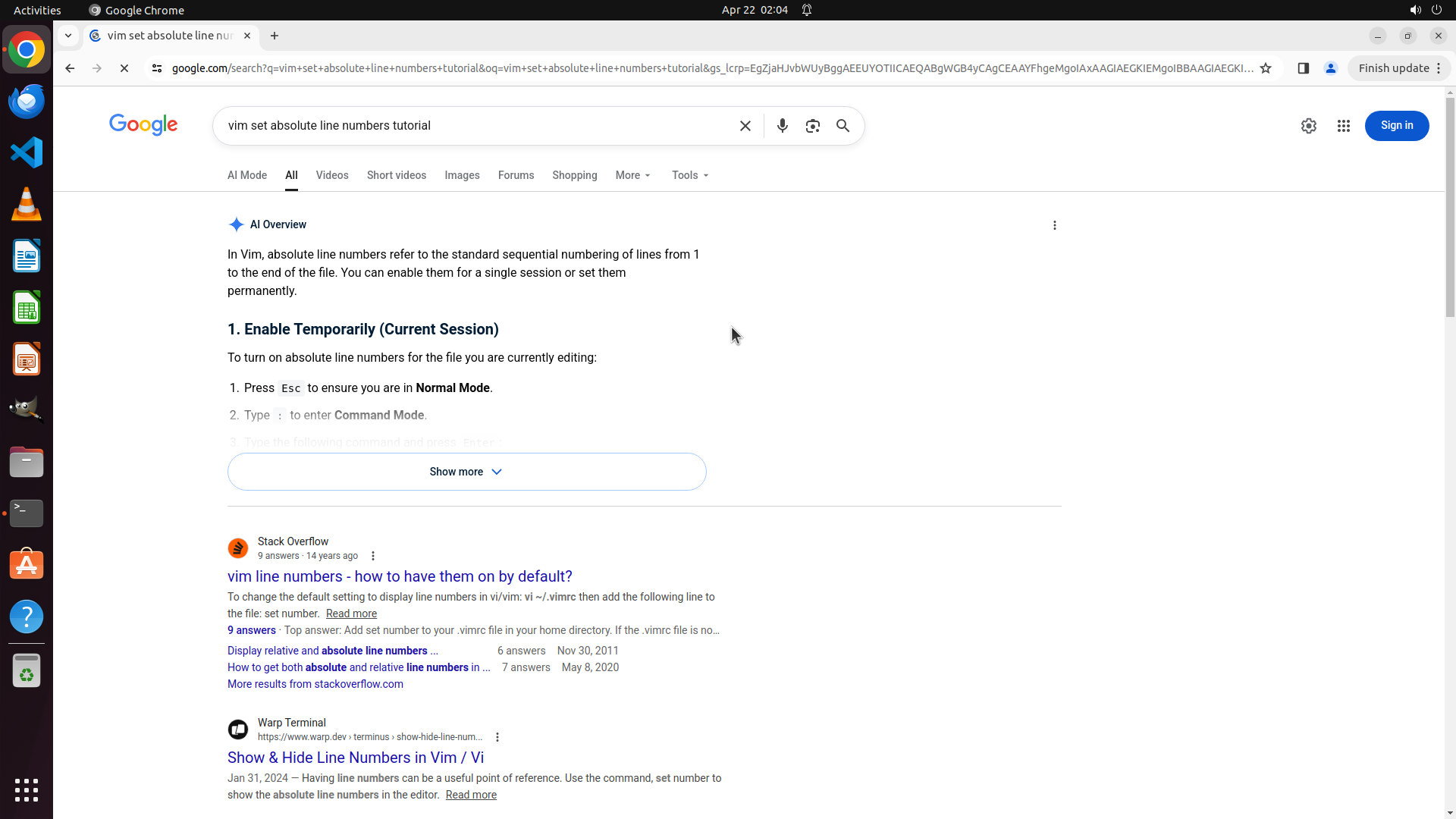 1.3: [pending] 在 Chrome 中搜索 'vim set absolute line numbers tutorial'
