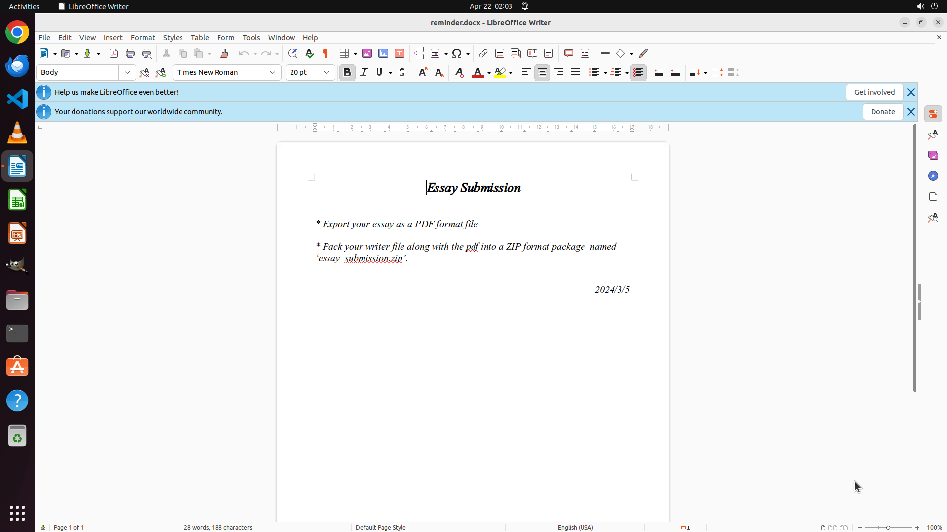 相关任务背景: The guidelines for submitting our essay work are provided in the "reminder.docx" on the Desktop. My essay is stored as a docx file in /home/user. Please assist me in organizing the files for submission according to the specified requirements.