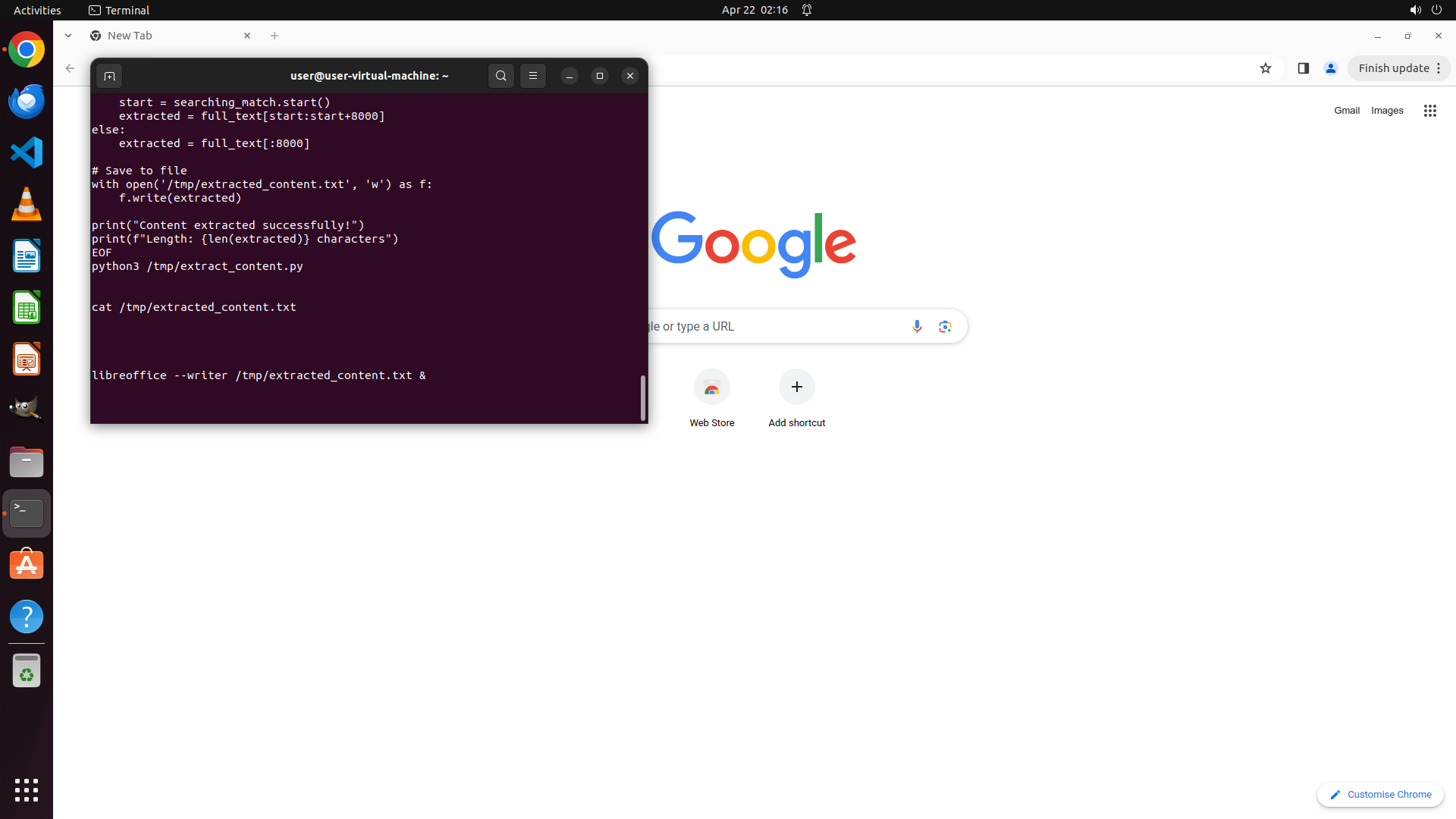 - 命令 `libreoffice --writer /tmp/extracted_content.txt &` 已在终端底部输入