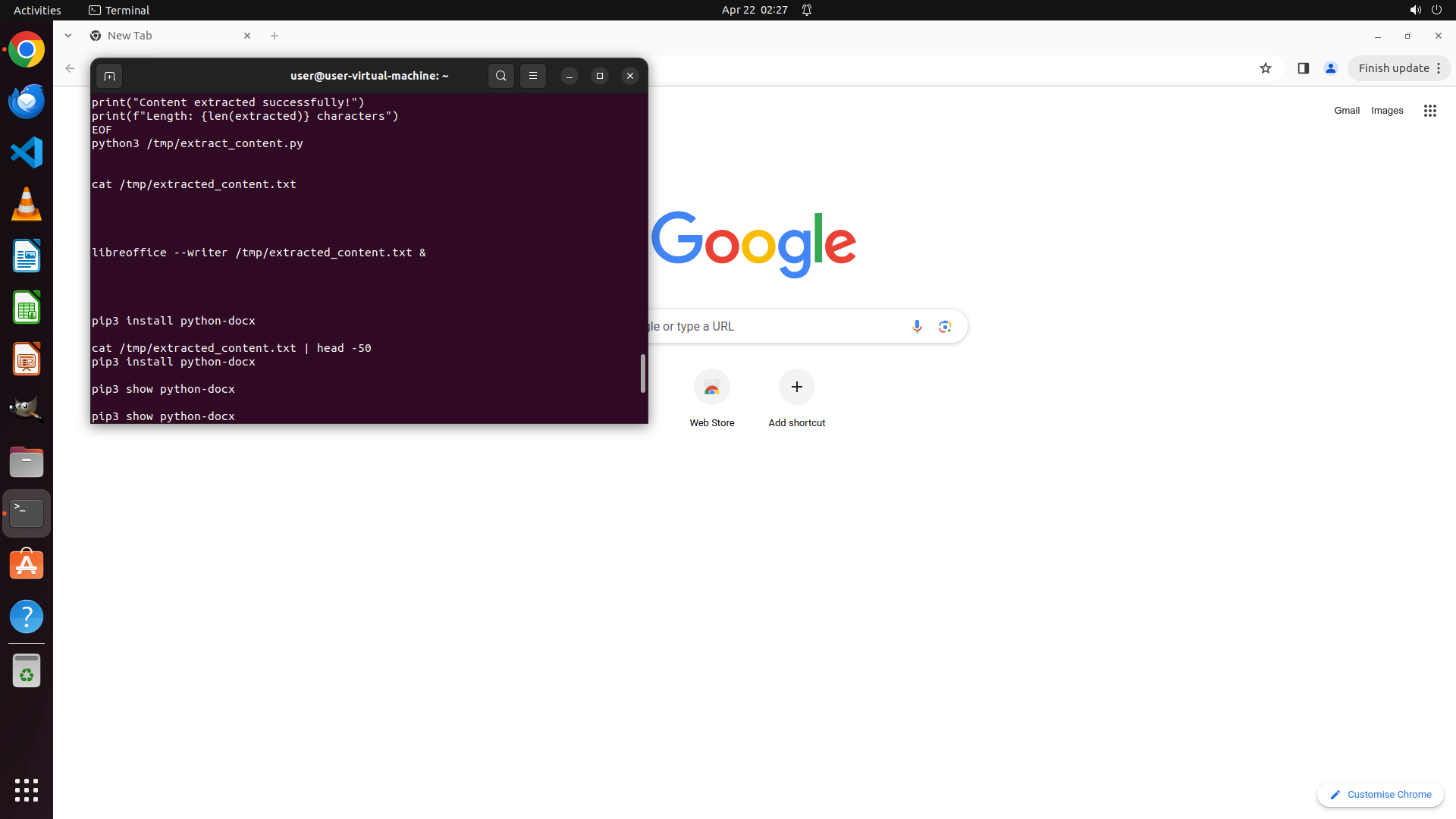 - 终端窗口显示了历史命令,包括 Python 脚本创建、LibreOffice 命令、pip3 安装等