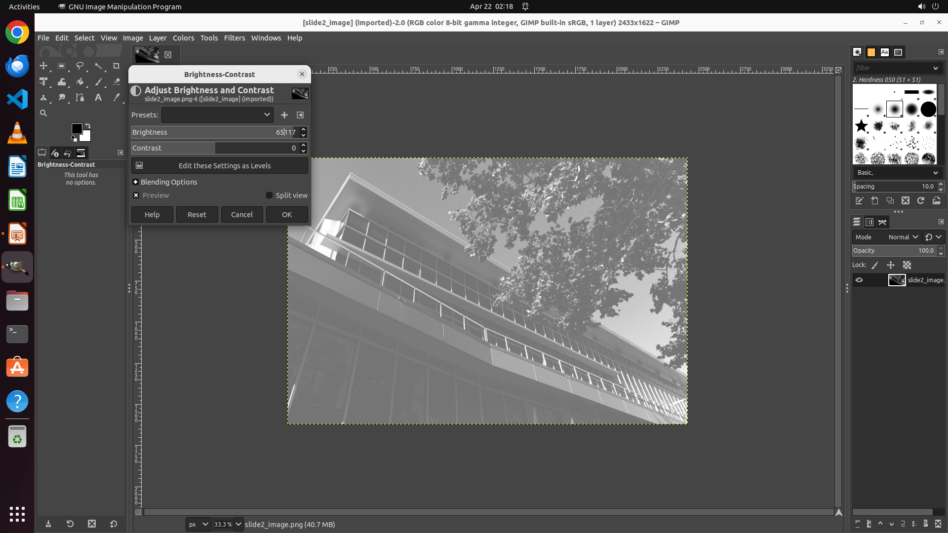 - The title bar confirms: "[slide2_image] (imported)-2.0 (RGB color 8-bit gamma integer, GIMP built-in sRGB, 1 layer) 2433x1622 – GIMP"