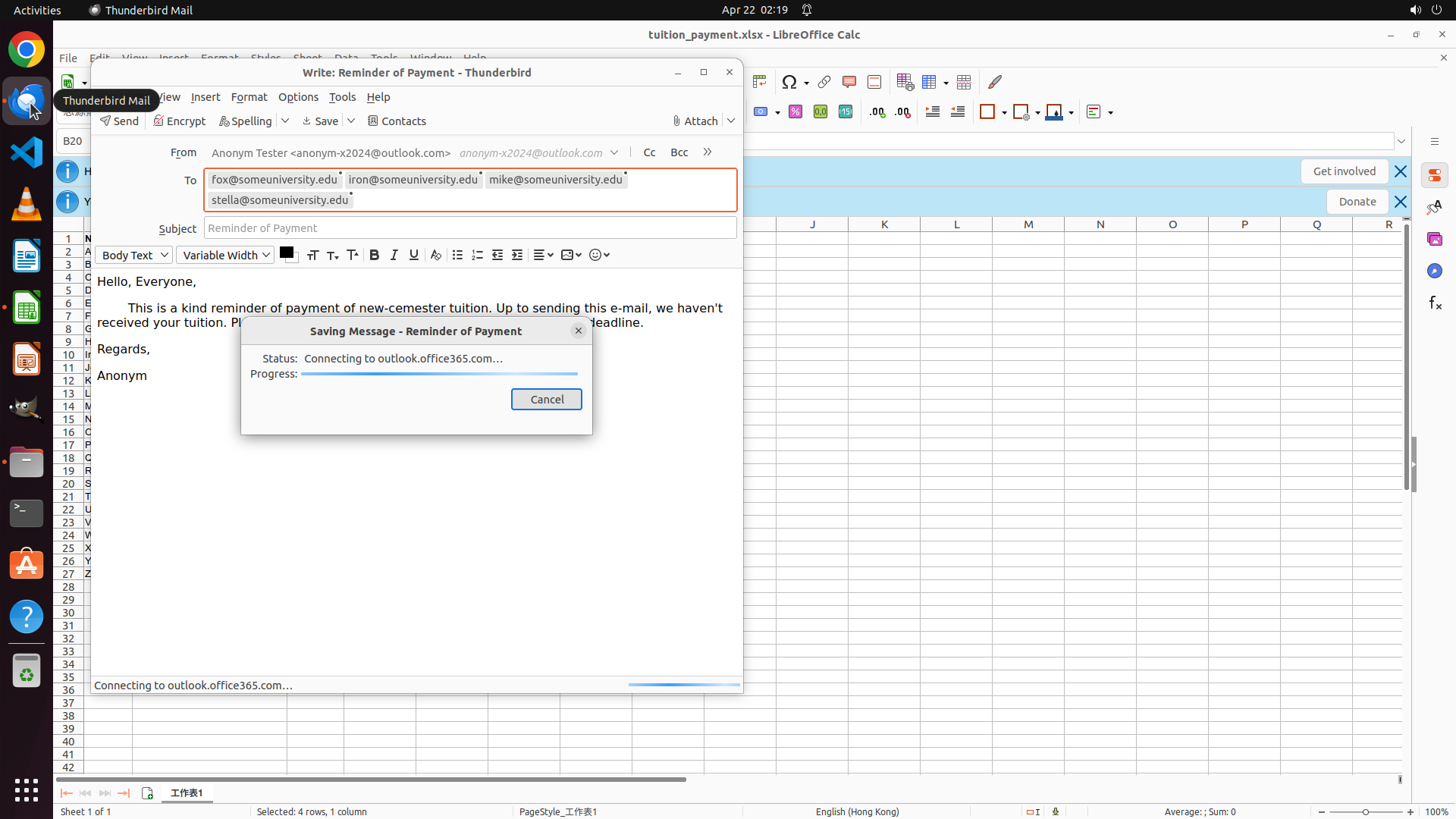 1. ✓ Extracted email addresses of students with unpaid tuition from the spreadsheet (Fox, Iron, Nancy, Stella)