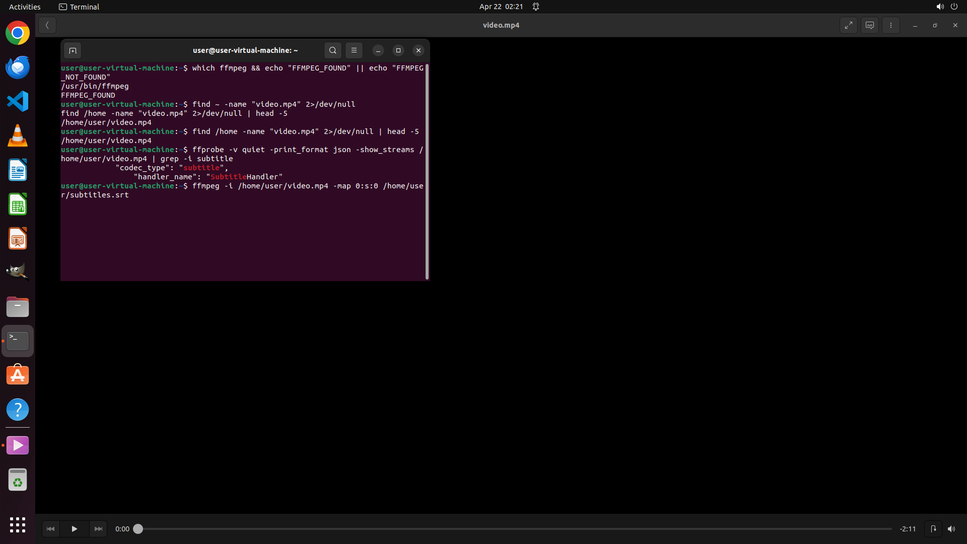 - Terminal shows command 'ffmpeg -i /home/user/video.mp4 -map 0:s:0 /home/user/subtitles.srt' executed successfully with 'Conversion failed' or similar error messages NOT present