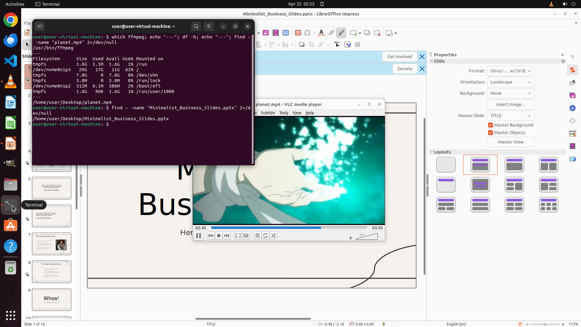 你的任务是:借助工具,来操作一台电脑来达成任务: I'm using libreoffice impress to write slideshows. I found that the video being played by VLC media player had a good soundtrack. Please extract the audio to planet.wav and use it as background music for this slideshow.。