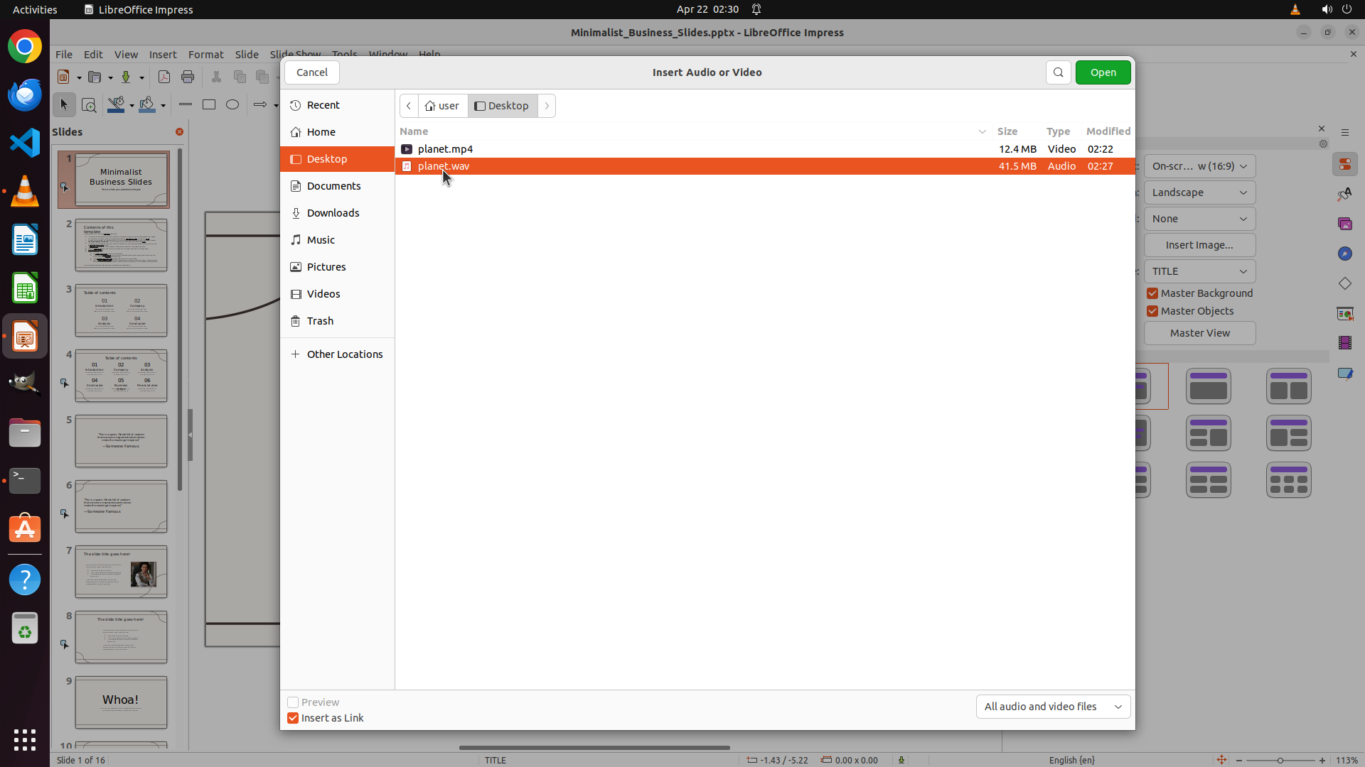 执行这个命令后,应该会在 Desktop 目录生成 planet.wav 文件。然后我需要将这个音频文件添加到 LibreOffice Impress 演示文稿中。