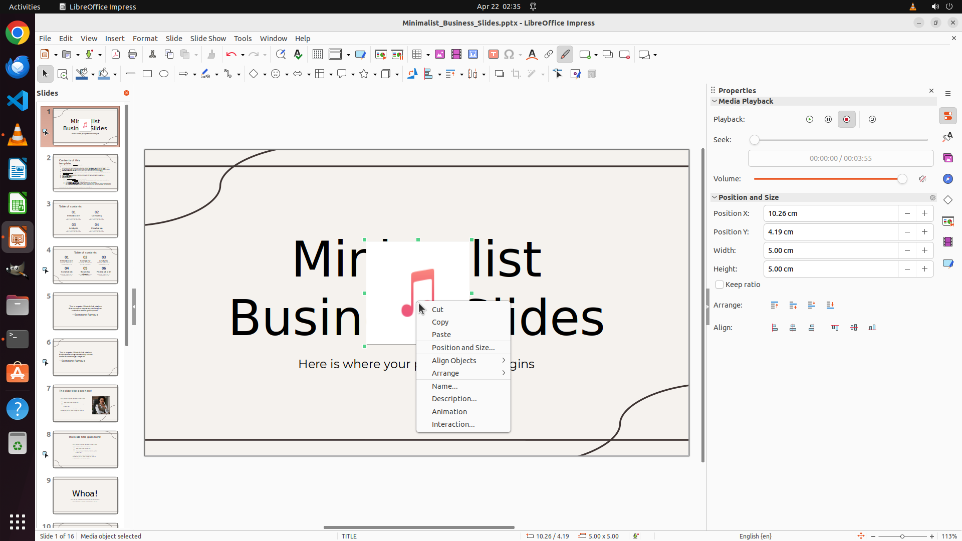 你的任务是:借助工具,来操作一台电脑来达成任务: I'm using libreoffice impress to write slideshows. I found that the video being played by VLC media player had a good soundtrack. Please extract the audio to planet.wav and use it as background music for this slideshow.。