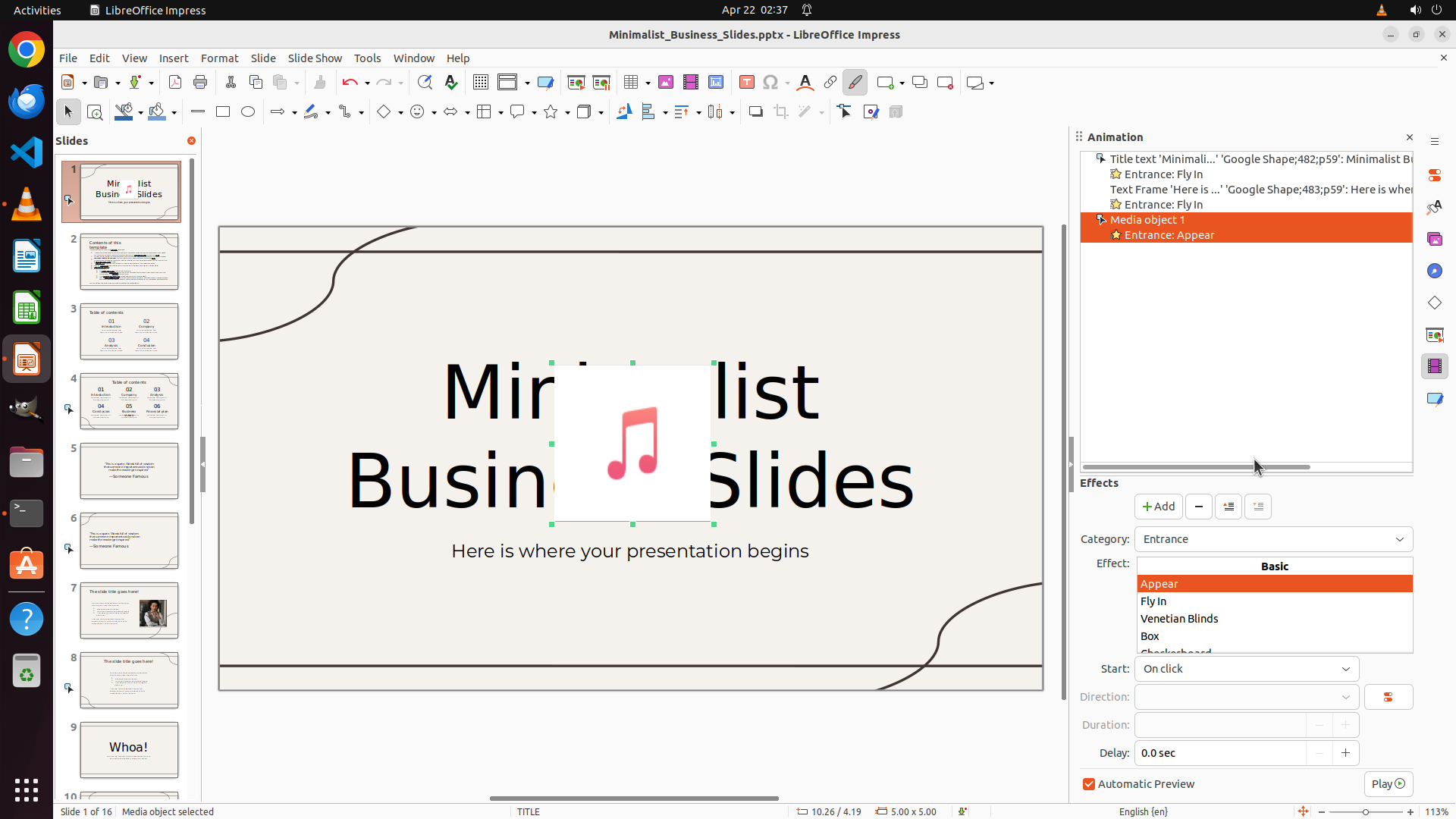 你的任务是:借助工具,来操作一台电脑来达成任务: I'm using libreoffice impress to write slideshows. I found that the video being played by VLC media player had a good soundtrack. Please extract the audio to planet.wav and use it as background music for this slideshow.。