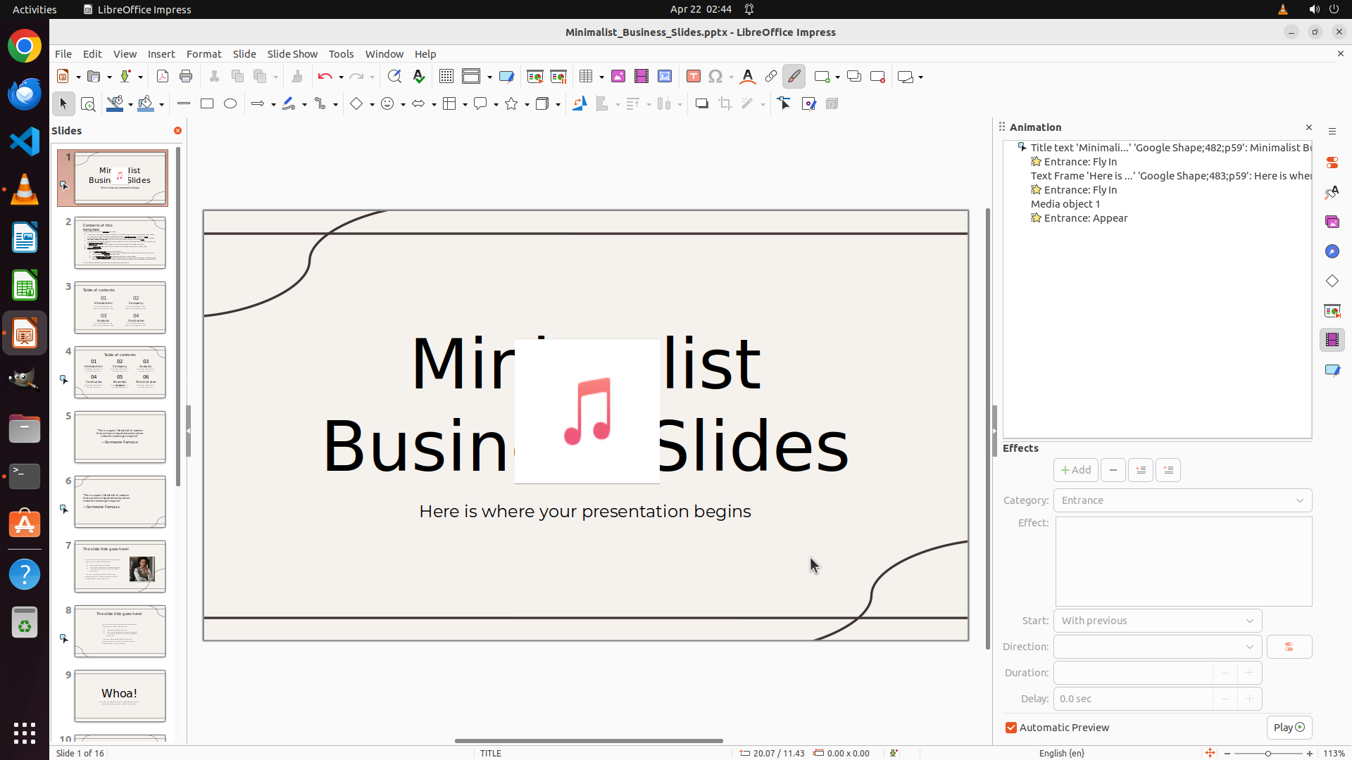 你的任务是:借助工具,来操作一台电脑来达成任务: I'm using libreoffice impress to write slideshows. I found that the video being played by VLC media player had a good soundtrack. Please extract the audio to planet.wav and use it as background music for this slideshow.。