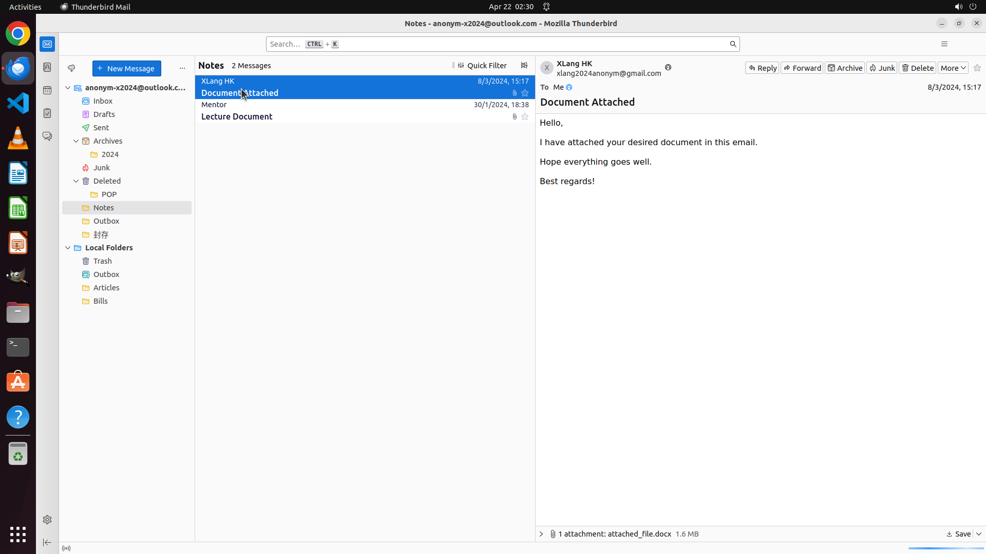 - Thunderbird邮件窗口显示'Document Attached'邮件,底部附件栏显示'attached_file.docx 1.6 MB'