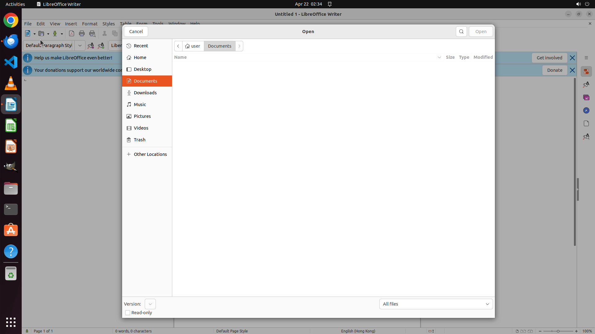 我可以看到左侧边栏有 LibreOffice Writer 的图标(文档图标),点击它可以启动 LibreOffice Writer。然后我将通过 File > Open 菜单打开刚才保存的 attached_file.docx 文件。