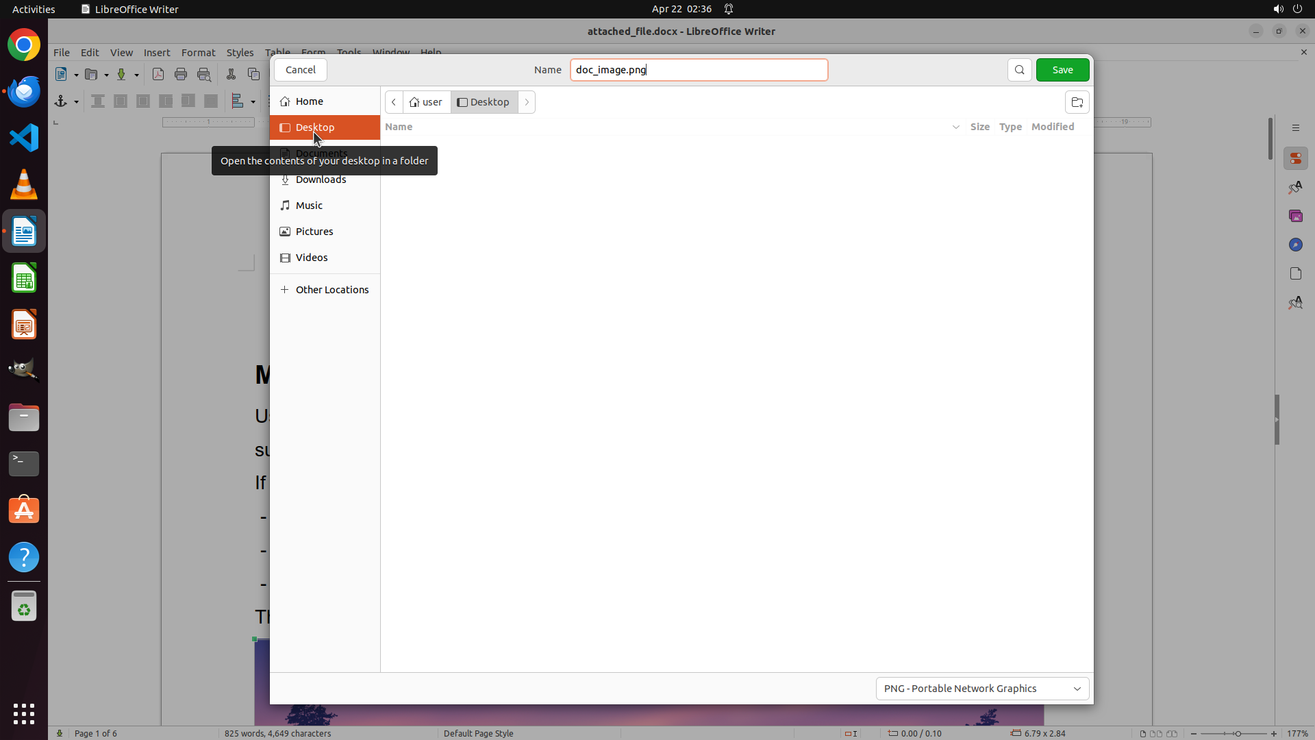 我可以看到左侧边栏有 LibreOffice Writer 的图标(文档图标),点击它可以启动 LibreOffice Writer。然后我将通过 File > Open 菜单打开刚才保存的 attached_file.docx 文件。